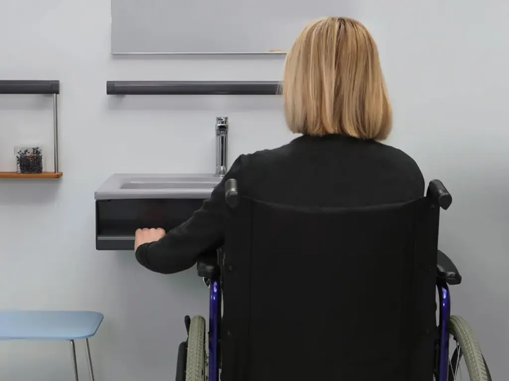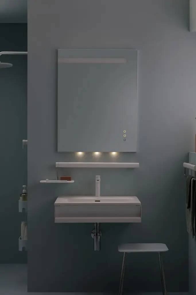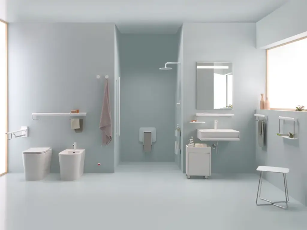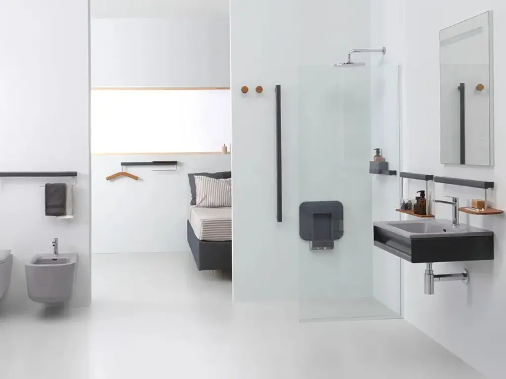 Omnia is a suspended rectangular washbasin. Fixings included. Available in 2 sizes.The OMNIA washbasin, with minimalist shapes, is available in ceramic in 65 and 100 cm widths and in acrylic stone in the standard 65 cm width (or other sizes on request). It is characterized by a bevel that runs along the perimeter of the basin and connects it with the top; a distinctive design that is also found in the bidet and in other products in the collection, such as the stool and the shower seat.To complete the washbasins, a metal structure equipped with a handle on the front to facilitate safe movement, a towel holder and an accessory holder to be applied as options on the sides.The new bathroom’s concept: safety, beauty and technology. A complete and adaptable collection for an enjoyable and safe bathroom environment, where self-care can be carried out naturally and serenely.This is OMNIA, a system that allows the design and arrangement of every area of the bathroom through innovative and functional solutions.Variously accessorized safety bars, shower seats, storage cabinets, washbasins, toilet pans, mirrors with integrated systems for air sanitization and requests for help... a blend of safety, aesthetics and technology designed to enhance the comfort and well-being in a discreet and intimate space such as the bathroom and beyond. OMNIA makes beautiful what must be safe.