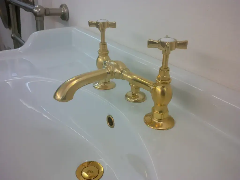 RL1013 - Low bridge tap 2 holes basin set with cm.20Large choice of high quality classic faucets in brass for washbasins with 1 or 3 holes and mixer. Several metal finishes available. Various handles available.