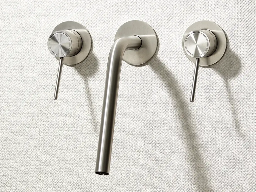 STIRIANA | Wall mounted tap. Wall mounted tap, hot and cold water with spout ø28 L.190 - stainless steel AISI 316 L.Available finishes:brushed stainless steel, polished stainless steel, deep grey, gold, ceraMINA colours.STIRIANA-characterized by simple and clean lines. Characterized mainly by spouts on the wall or free standing, offers a wide range of items that blend perfectly with any style of bathroom.The collection is also available in a CeraMINA version: a palette of ceramic colours with pearl shades designed to find the most suitable shade for every project.From pearl black to calm green, passing through sweet blue, light rose, rich brown, vivid orange and golden yellow.