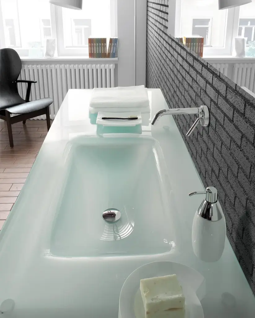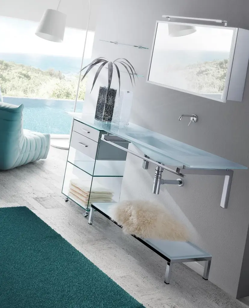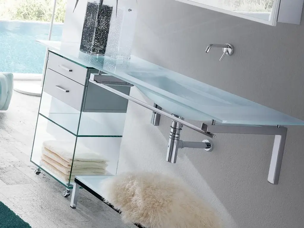 Tiffany 760 is a bathroom composition.The price does not include the bench and the trolley.With Tiffany collection it is possible to realize glass top in several shapes and dimensions. The crystal washbasin is the essential element of Tiffany collection. Combined with simple metal structures, owing to the flexibility of its components it can suit all different needs, changing its appearance, but not its lightness, transparency, brightness and appeal.