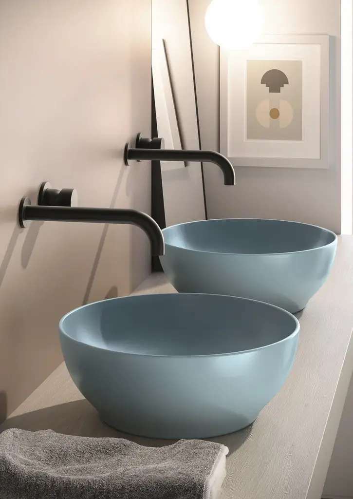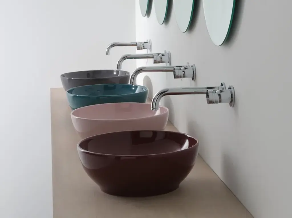 TREND is a round countertop washbasin without and with single hole. Available in different sizes and colors.The low height and visible edge of the TREND washbasins ensure an unmistakable style of furnishing. The comfortable and deep basin is without overflow hole. The elegant style and functional character make it possible to adapt the washbasin to different environments and surfaces.The sit on basins are ample even if their dimensions are not too big, thanks to the thin border that increases their capacity.