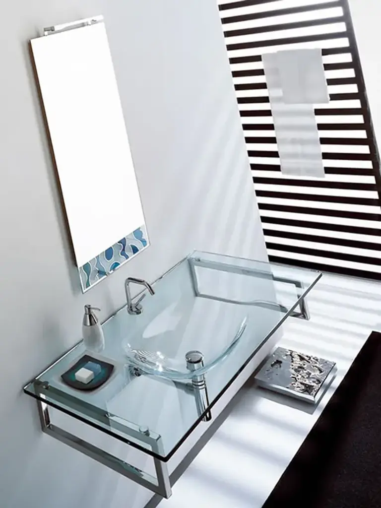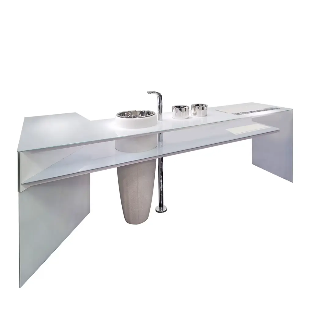 UNIK 4 is a single wall-mounted crystal washbasin, silver finish.The price refers to:UN / 10 Structure - 40.5 x 38.5 x H 15 cmUN / 06 Washbasin / Top - 60 x 41.5 x H 18 cmThe Unik collection consists of practical crystal consoles for small spaces. conceived especially for installation in small spaces, they propose bright colours and special finishes, like gold, silver and copper. the version for installation over the top and the built-in version create simple and aesthetically pleasing solutions.