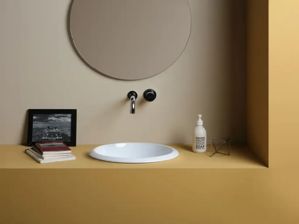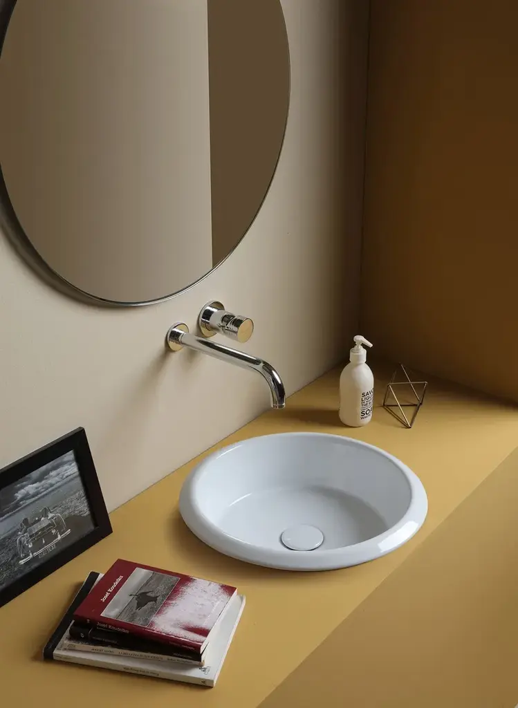 VINYL is a round built-in ceramic washbasin.The VINYL series washbasin is suitable for the most varied needs that can be had in the bathroom, in fact it is possible to apply on a pleasant and elegant shelf (also available without decal complete with white drain).