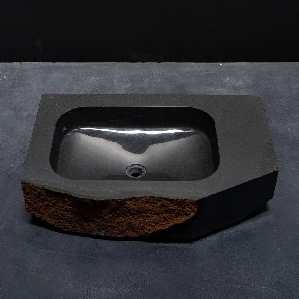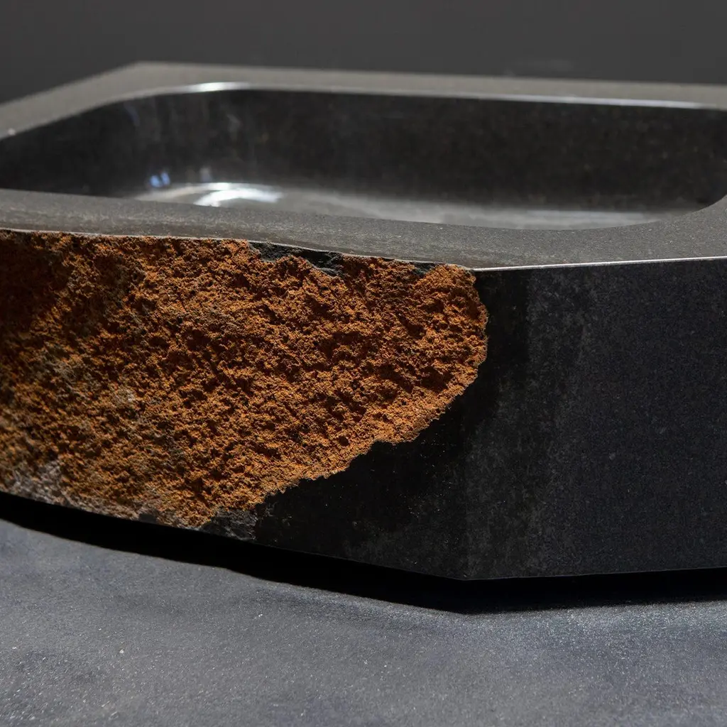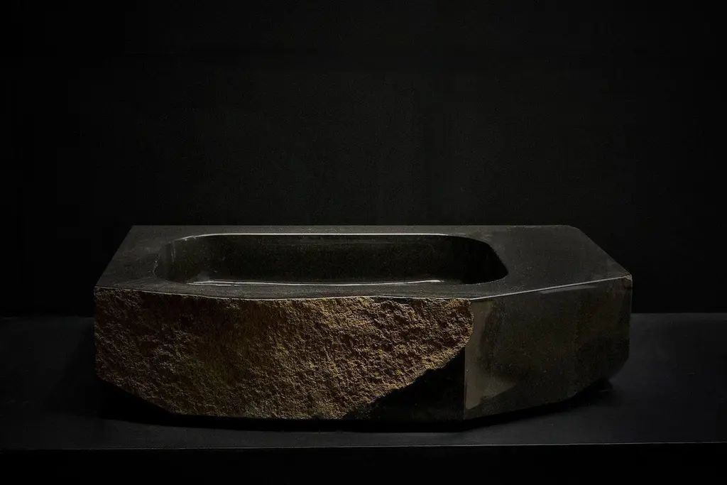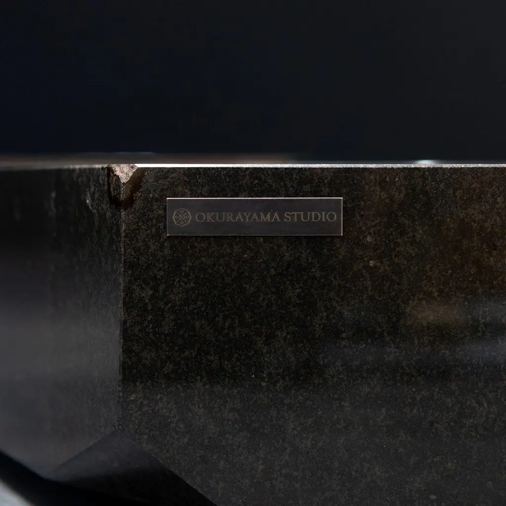 Washbasin S9 Sink by OkurayamaOne Of A Kind.Dimensions: D 42,5 x W 66 x H 14,7 cm.Material: Daté Kan Stone.Rich colors and patterns drawn by the work of the earth of over 20 million years. This washbasin is made using multiple traditional craftsman techniques – chiseling, water polishing and basic polishing, so as to not damage its natural expression.The Daté Kan Stone is a rare stone that exist only in a few mountains in Japan.The defining characteristic of Date´ Kan Stone is that its surface and interior are completely different in appearance. Just when you think the surface is ocher in color, rust-colored sections and reddish-brown streaks like those found on Bizen pottery will appear. No two pieces have the same appearance. The stone’s interior, however, is a uniformly dark-gray color with rusty hues that slowly become more prominent as the years go by. That contrast can be utilized to produce a stone that looks like none other in the world; gorgeous ocher and reddish-brown sections are left partially visible while cut edges are polished to a glossy sheen. This unique process of shaping the stone’s appearance leverages the experience and aesthetic sense that Okurayama Studio has developed through our interaction with a multitude of creators.Date´ Kan Stone is a kind of basalt / igneous rock known as two-pyroxene basaltic andesite that was created around 20 million years ago. It has a dense grain and high specific gravity due to its significant iron content, which makes it resistant to water and gives it a brilliant luster when polished.Visitors to the Okurayama quarry can observe raw Date´ Kan ore in a variety of forms such as the columnar joints that protrude from the Earth’s surface and the weathered round boulders that are mined from it. Columnar joints are created when cooling magma hardens and contracts, generating fissures on the cooled surface which then spread internally in the vertical direction. The rusty color characteristic of Okurayama’s stone is believed to be the result of air and moisture penetrating these fissures and oxidizing the iron content of the columnar joints on the two occasions when the area sunk to the ocean floor due to shifts in the Earth’s crust.Cutting the Date´ Kan ore in sections parallel to the joints gives it sculpted shapes that provide a wealth of inspiration even in their unprocessed forms. The wholly unique form and appearance of Date´ Kan Stone continues to fascinate architects, artists, and designers both within Japan and abroad.At Okurayama Studio, the highly skilled staff handles the entire process of quarrying, processing, and shaping our Date´ Kan Stone, which is internationally renowned for its unique appearance.
