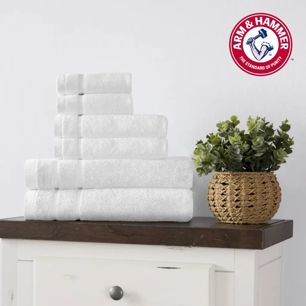Experience the gentle luxury of towels designed especially for sensitive skin. Crafted from a unique blend of soft cotton and rayon from bamboo, these advanced towels offer enduring softness without harmful irritants. Lower-lint and effortlessly machine washable, they maintain their pristine appearance over time. With antimicrobial protection, these Arm & Hammer™ towels stay fresher for longer, effectively resisting mildew odors. Elevate your self-care routine with towels specifically made for the comfort of sensitive skin.