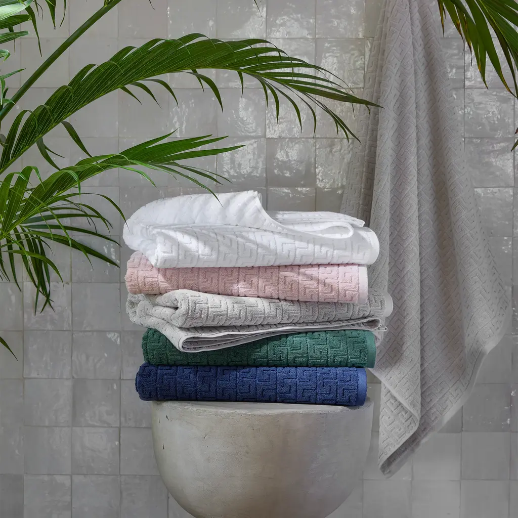 The sculpted Athena Collection from Matouk features a Greek key motif is based on a Schumacher fabric and adds an air of subtle elegance to any bathroom. Crafted in 100% cotton, it comes in a series of sublime hues.