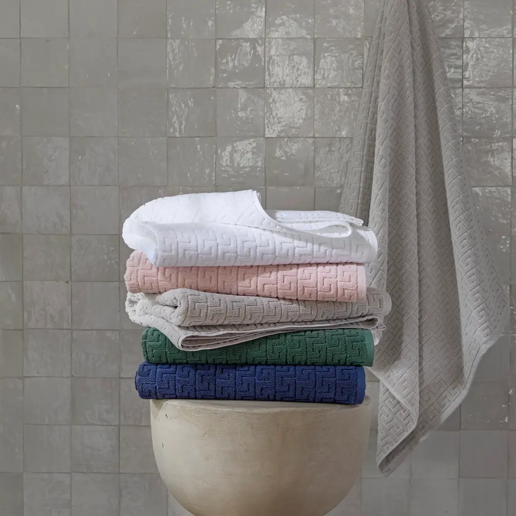 The sculpted Athena Collection from Matouk features a Greek key motif is based on a Schumacher fabric and adds an air of subtle elegance to any bathroom. Crafted in 100% cotton, it comes in a series of sublime hues.