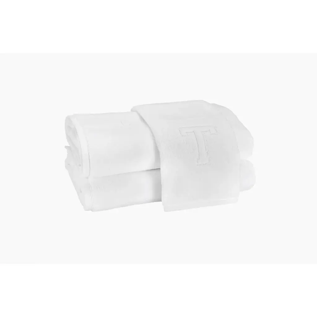 Soft, plush cotton terry towels featuring a bottom center decorative relief capital letter.