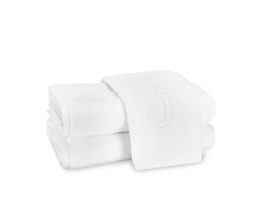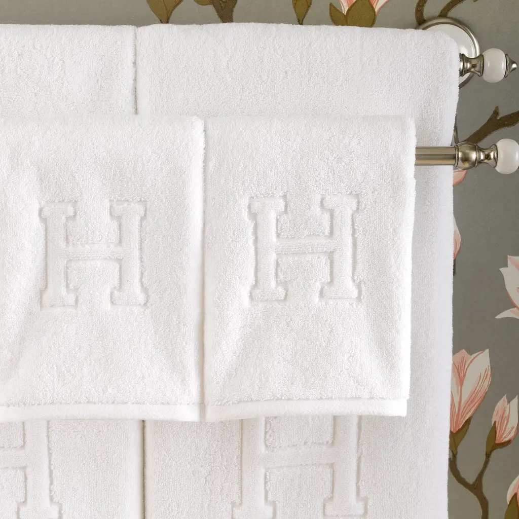 Soft, plush cotton terry towels featuring a bottom center decorative relief capital letter.