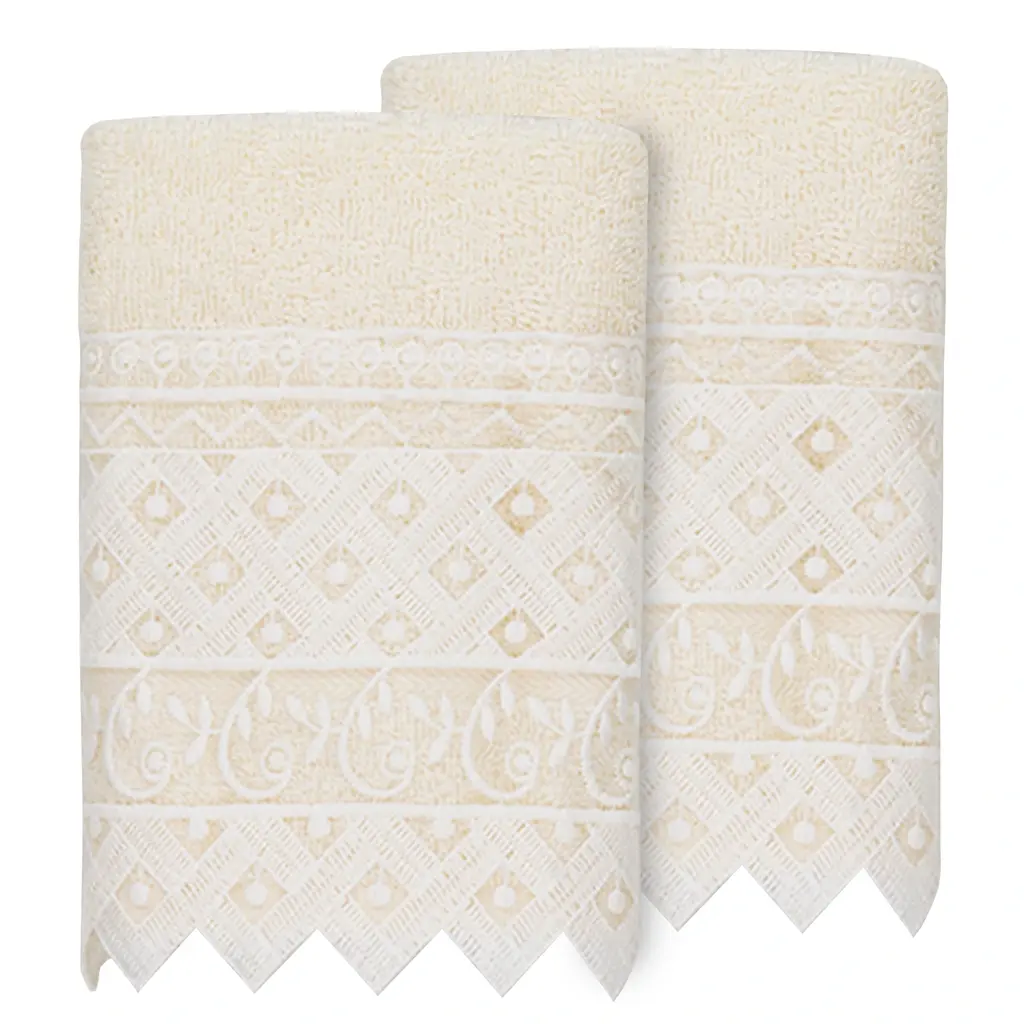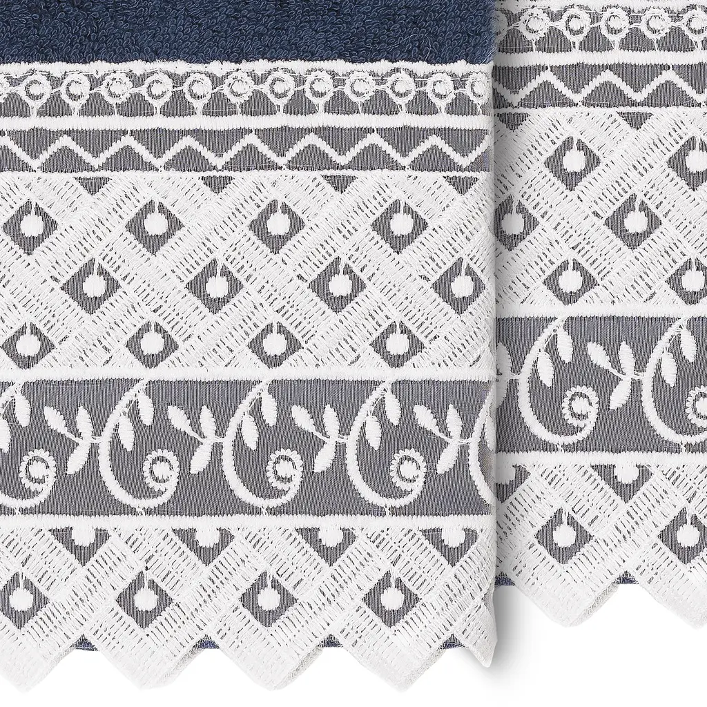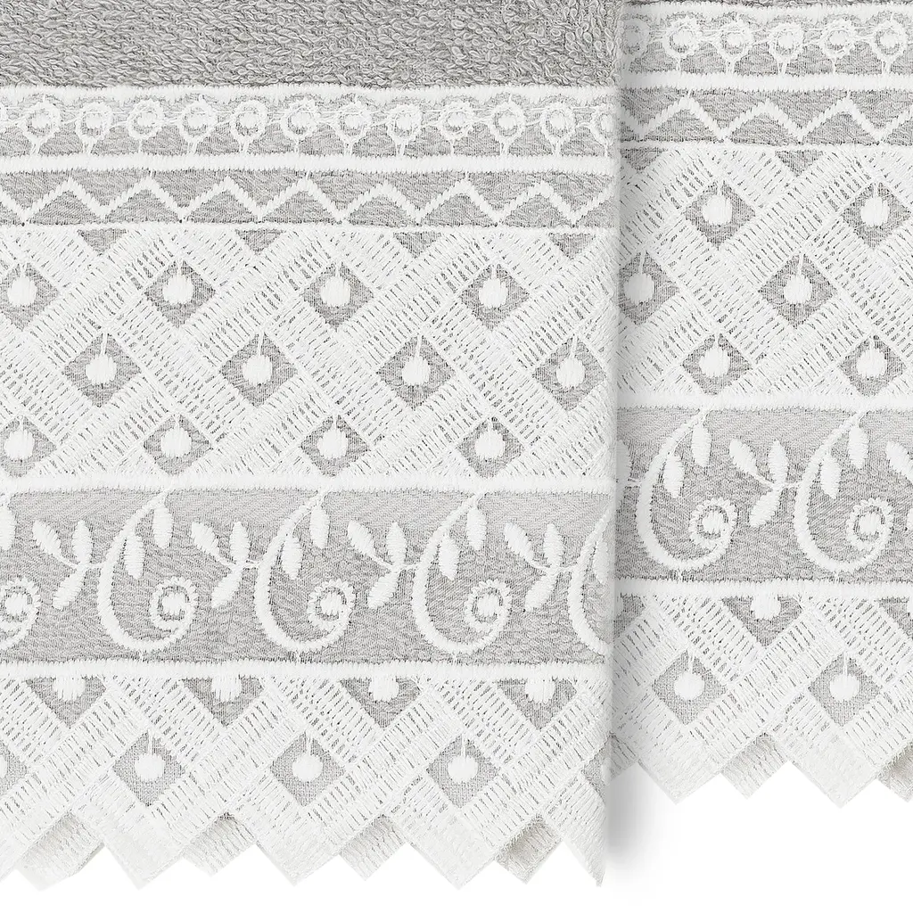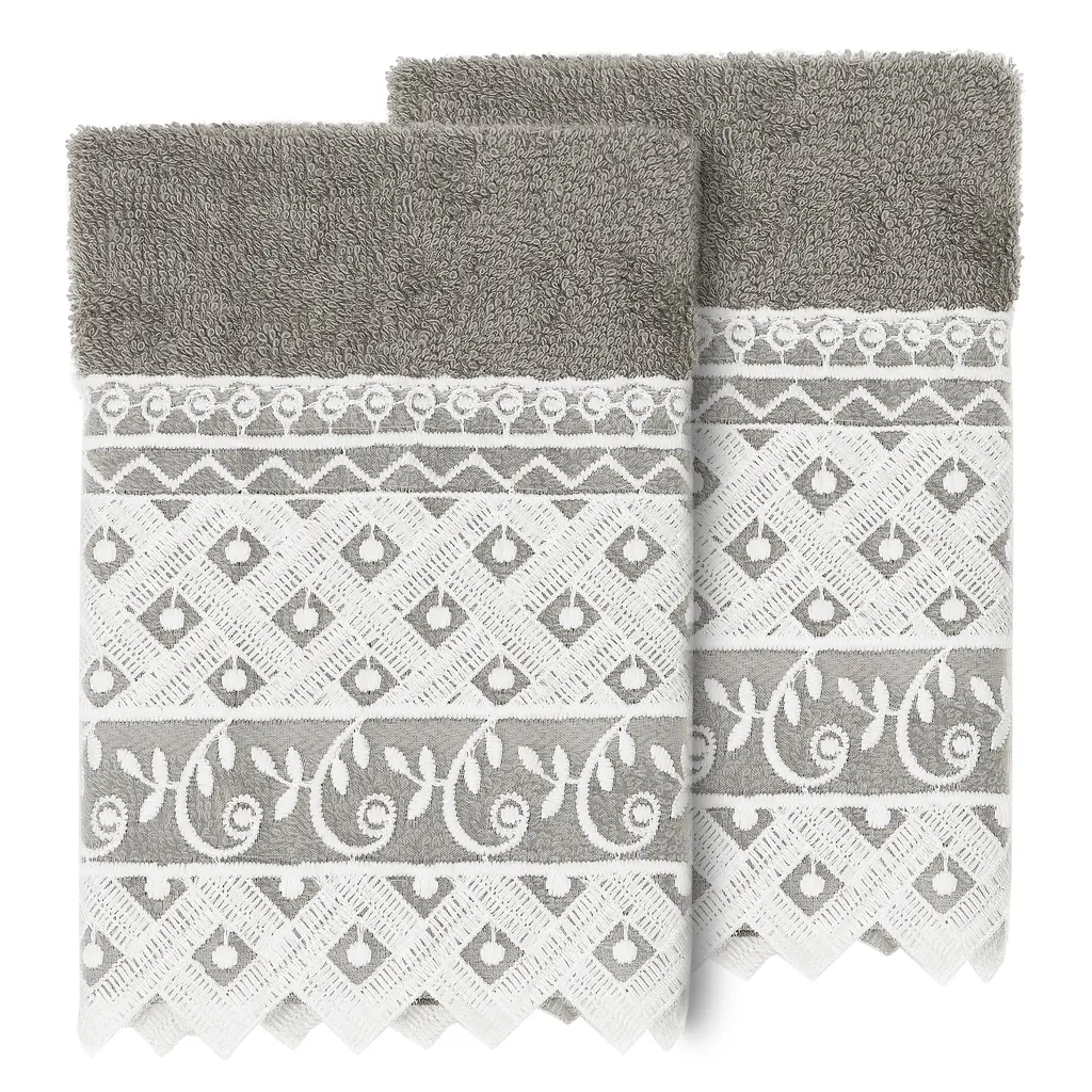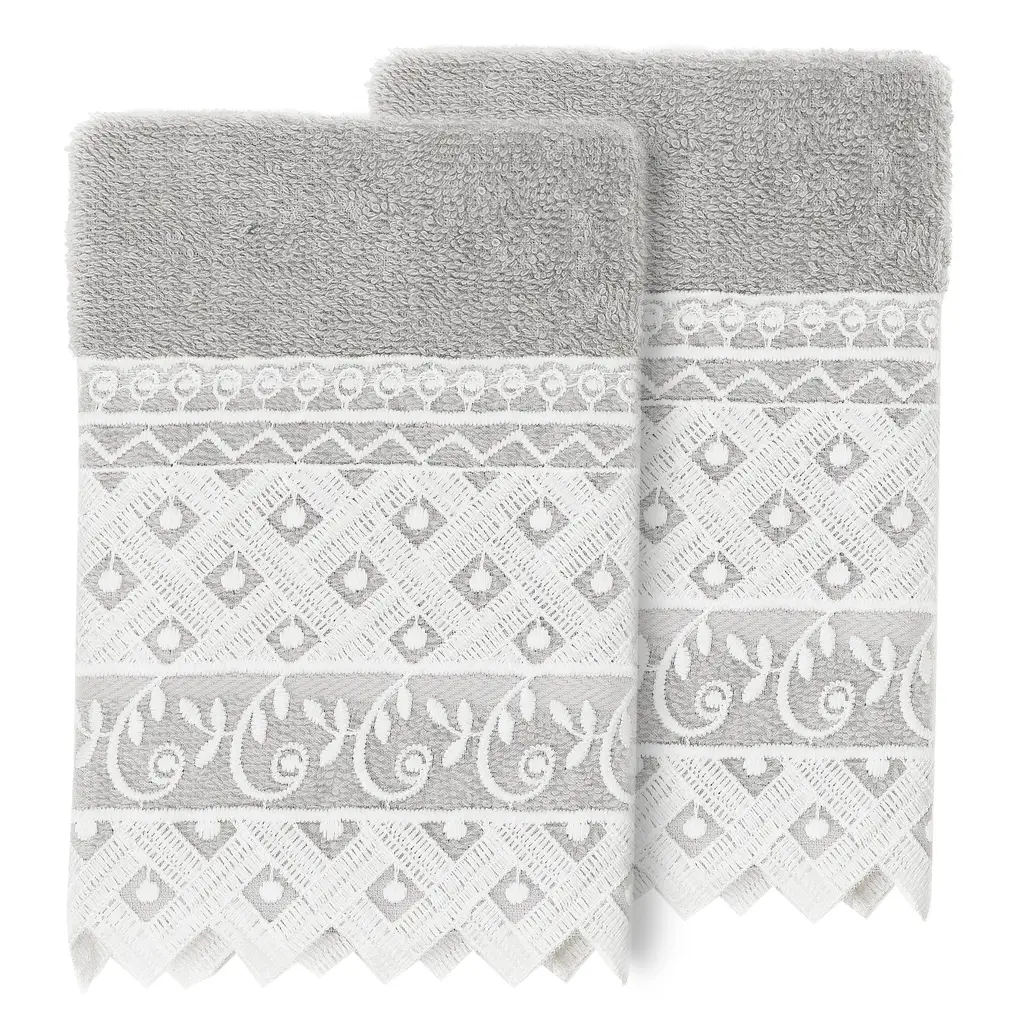 The Aiden Lace Towel Collection features an intricate floral trellis motif, embroidered on a white organza lace border with scalloped bottom edge. These soft and luxurious towels are made of 100% premium Turkish Cotton and offer lasting absorbency and superior durability. The Aiden Lace Collection will bring a graceful note to your bath decor.100% Premium Turkish CottonSuperbly absorbent and quick dryingAvailable in a range of lovely towel colorsMachine wash cold, No bleach, line dry or dry cleanSet includes 2 washcloths (13" x 13")Made in TurkeyProudly Embellished in USA