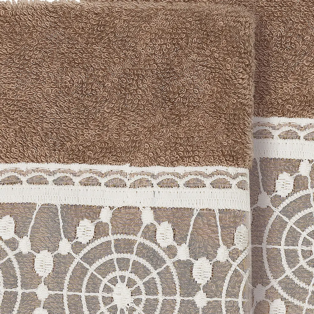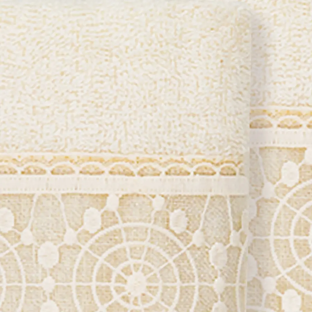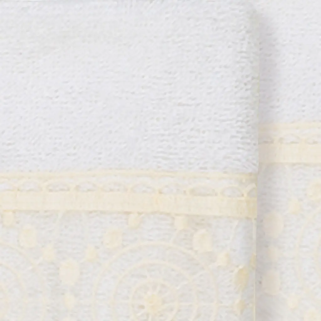 The Arian Lace Towel Collection features an elegant circles motif, embroidered on a cream organza lace border with scalloped bottom edge. These soft and luxurious towels are made of 100% premium Turkish Cotton and offer lasting absorbency and superior durability. The Arian Lace Collection will bring a sophisticated note to your bath decor.100% Premium Turkish CottonSuperbly absorbent and quick dryingAvailable in a range of lovely towel colorsMachine wash cold, No bleach, line dry or dry cleanSet includes 2 washcloths (13" x 13")Made in TurkeyProudly Embellished in USA