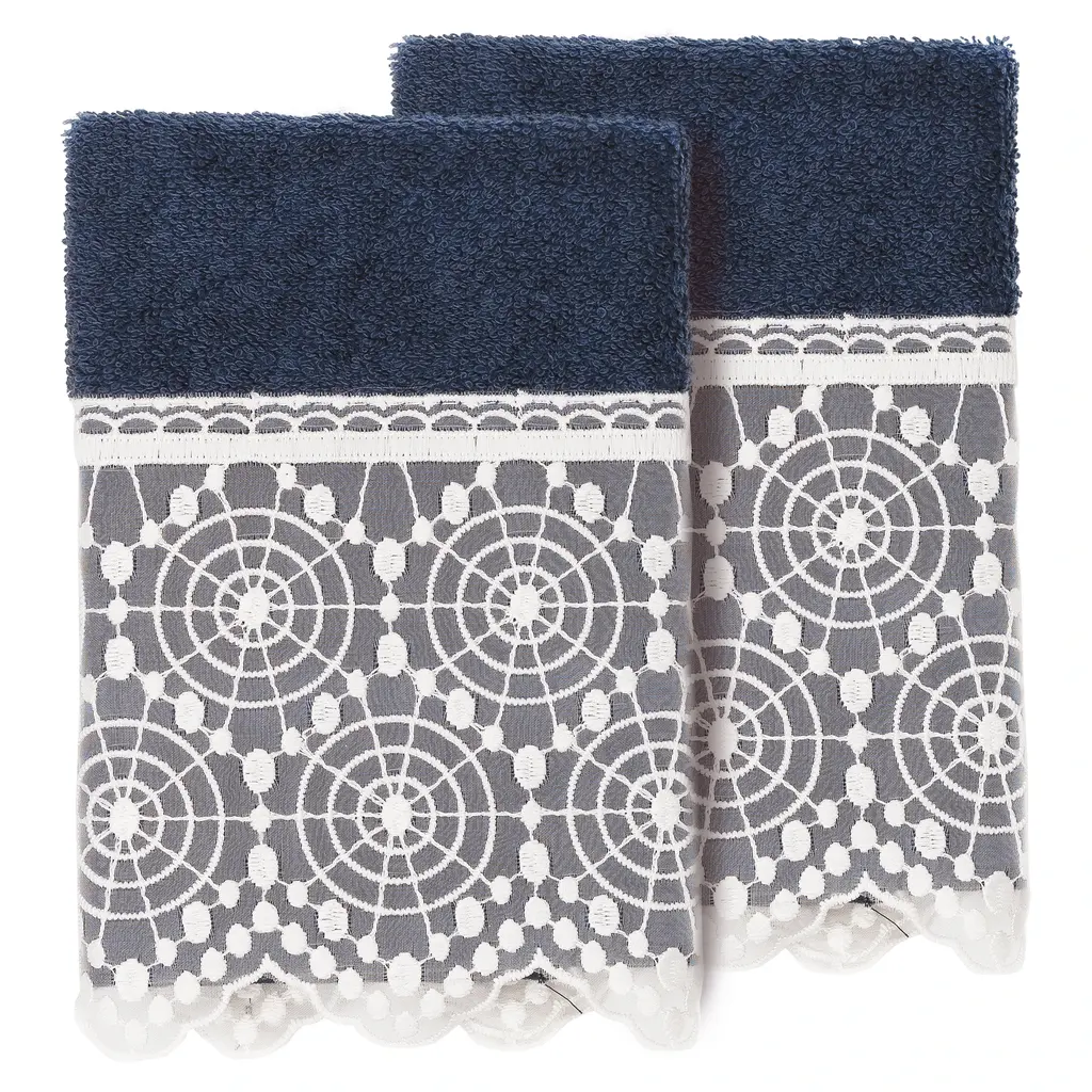 Authentic Hotel And Spa 100% Turkish Cotton Arian 2Pc Cream Lace Embellished Washcloth Set - Navy