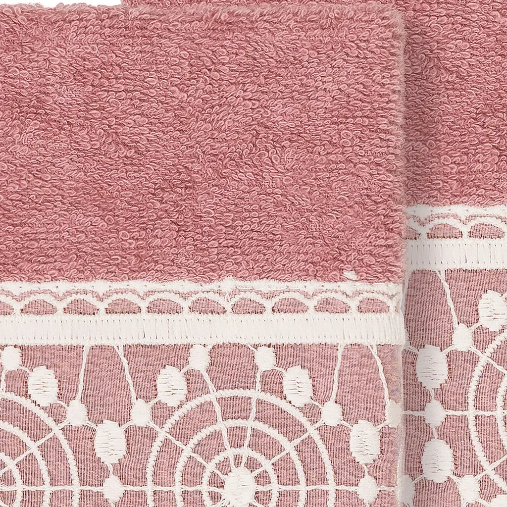 Authentic Hotel And Spa 100% Turkish Cotton Arian 2Pc Cream Lace Embellished Washcloth Set - Tea Rose