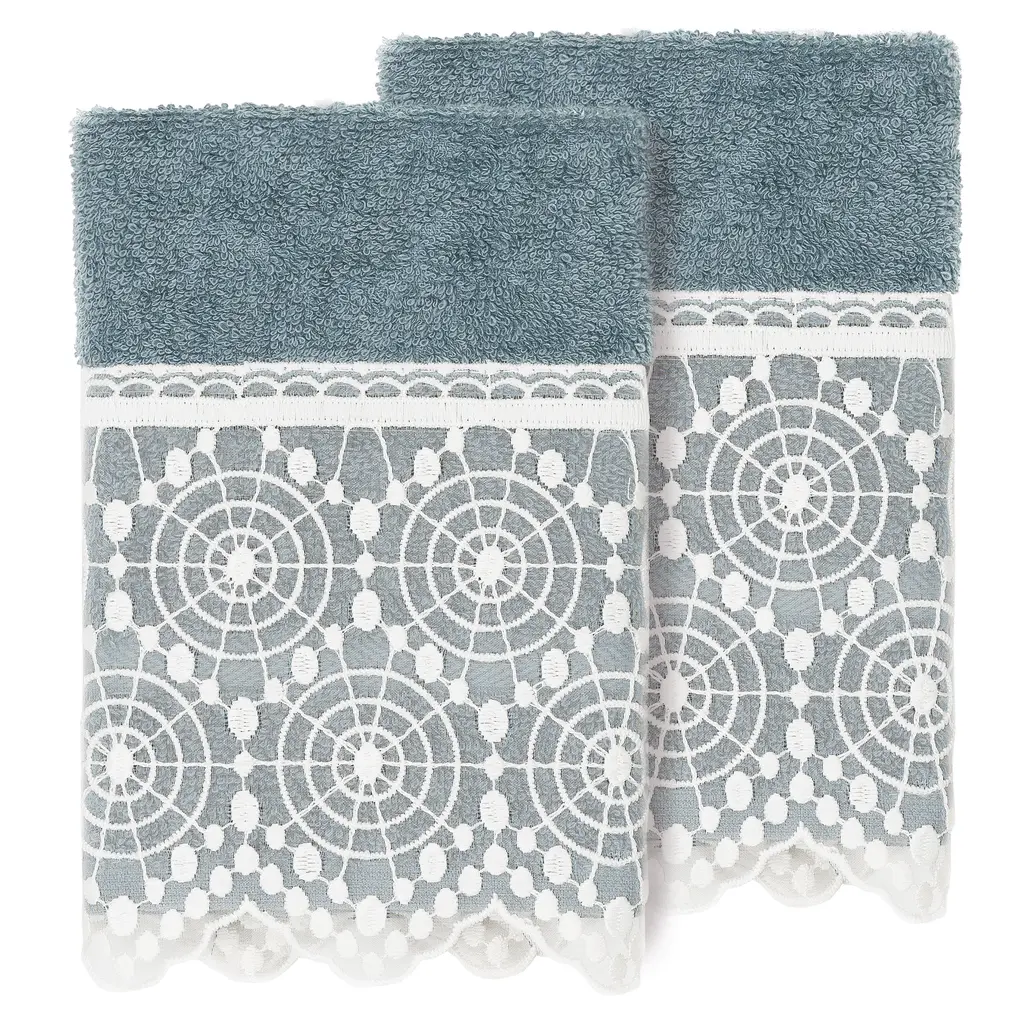 The Arian Lace Towel Collection features an elegant circles motif, embroidered on a cream organza lace border with scalloped bottom edge. These soft and luxurious towels are made of 100% premium Turkish Cotton and offer lasting absorbency and superior durability. The Arian Lace Collection will bring a sophisticated note to your bath decor.100% Premium Turkish CottonSuperbly absorbent and quick dryingAvailable in a range of lovely towel colorsMachine wash cold, No bleach, line dry or dry cleanSet includes 2 washcloths (13" x 13")Made in TurkeyProudly Embellished in USA
