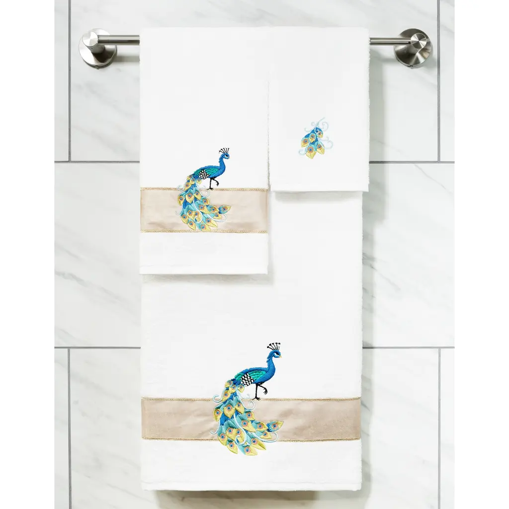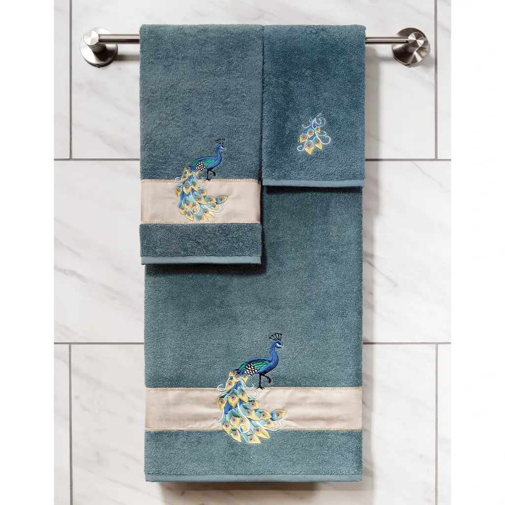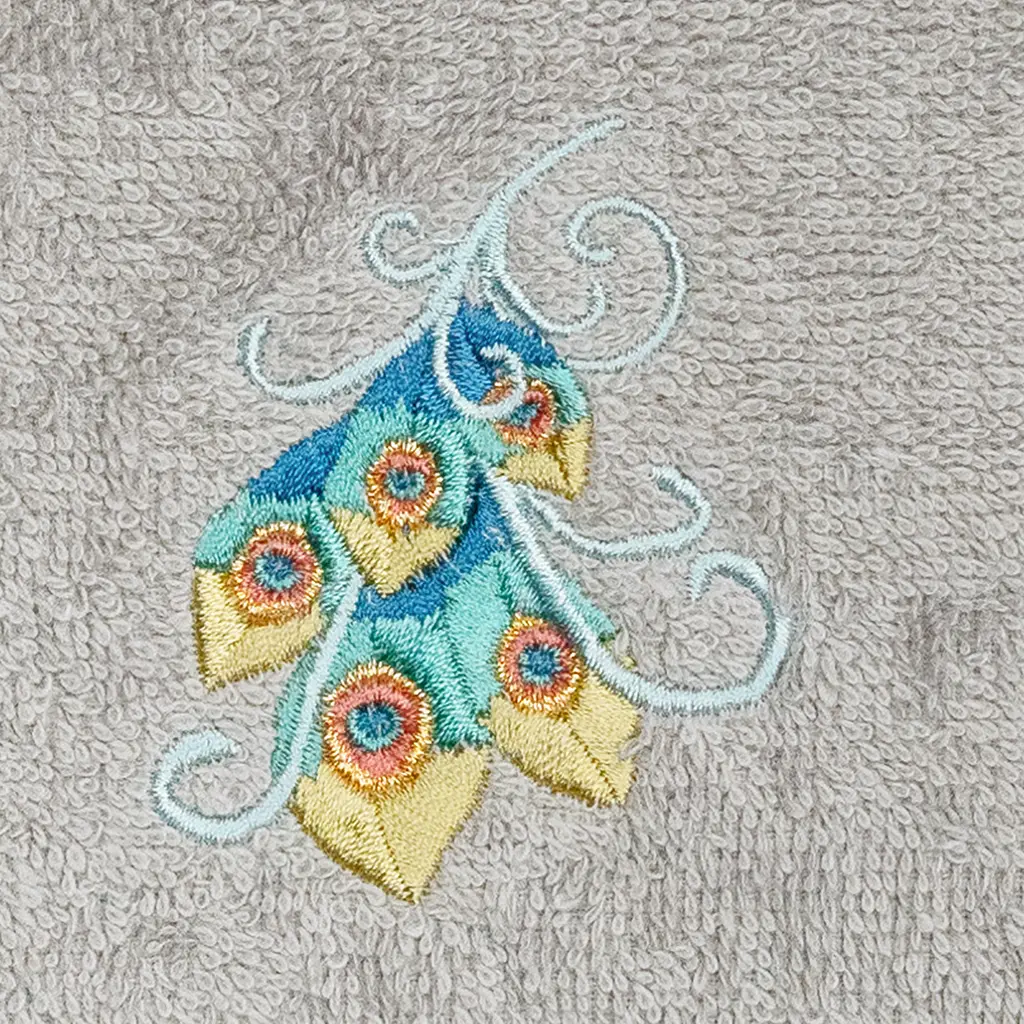 Your decorations are not complete without exotic embroidered towels for the comfort of your family and guests. The Penelope towels feature an intricate peacock embroidery on a sparkling tafetta border. Cloud soft and super absorbent, these luxurious, durable towels keep their plush appearance after washing. This collection is available in 7 elegant colors: White, Cream, Latte, Teal, Navy, Light Gray and Dark Gray. The Penelope Towel Collection brings a glamorous spirit and richness to your home decor and makes a great gift. Note: Due to variations in computer screen resolutions, slight color differences may exist between images provided and actual product.Embroidered Peacock design100% Premium Turkish CottonSuperbly absorbent and quick dryingAvailable in 7 elegant colorsMachine wash cold, No bleach, line dry or dry cleanSet includes 2 washcloth (13" x 13")Made in TurkeyProudly Embellished in USA