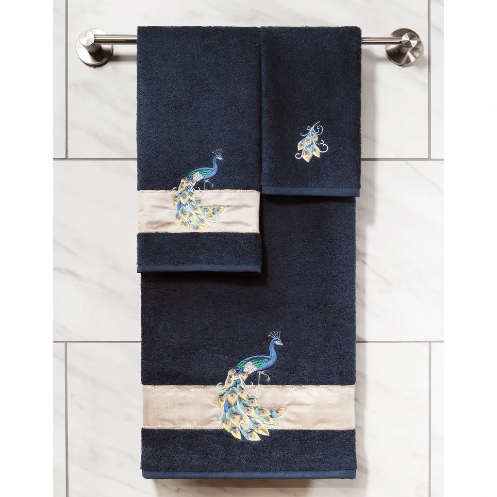 Your decorations are not complete without exotic embroidered towels for the comfort of your family and guests. The Penelope towels feature an intricate peacock embroidery on a sparkling tafetta border. Cloud soft and super absorbent, these luxurious, durable towels keep their plush appearance after washing. This collection is available in 7 elegant colors: White, Cream, Latte, Teal, Navy, Light Gray and Dark Gray. The Penelope Towel Collection brings a glamorous spirit and richness to your home decor and makes a great gift. Note: Due to variations in computer screen resolutions, slight color differences may exist between images provided and actual product.Embroidered Peacock design100% Premium Turkish CottonSuperbly absorbent and quick dryingAvailable in 7 elegant colorsMachine wash cold, No bleach, line dry or dry cleanSet includes 2 washcloth (13" x 13")Made in TurkeyProudly Embellished in USA