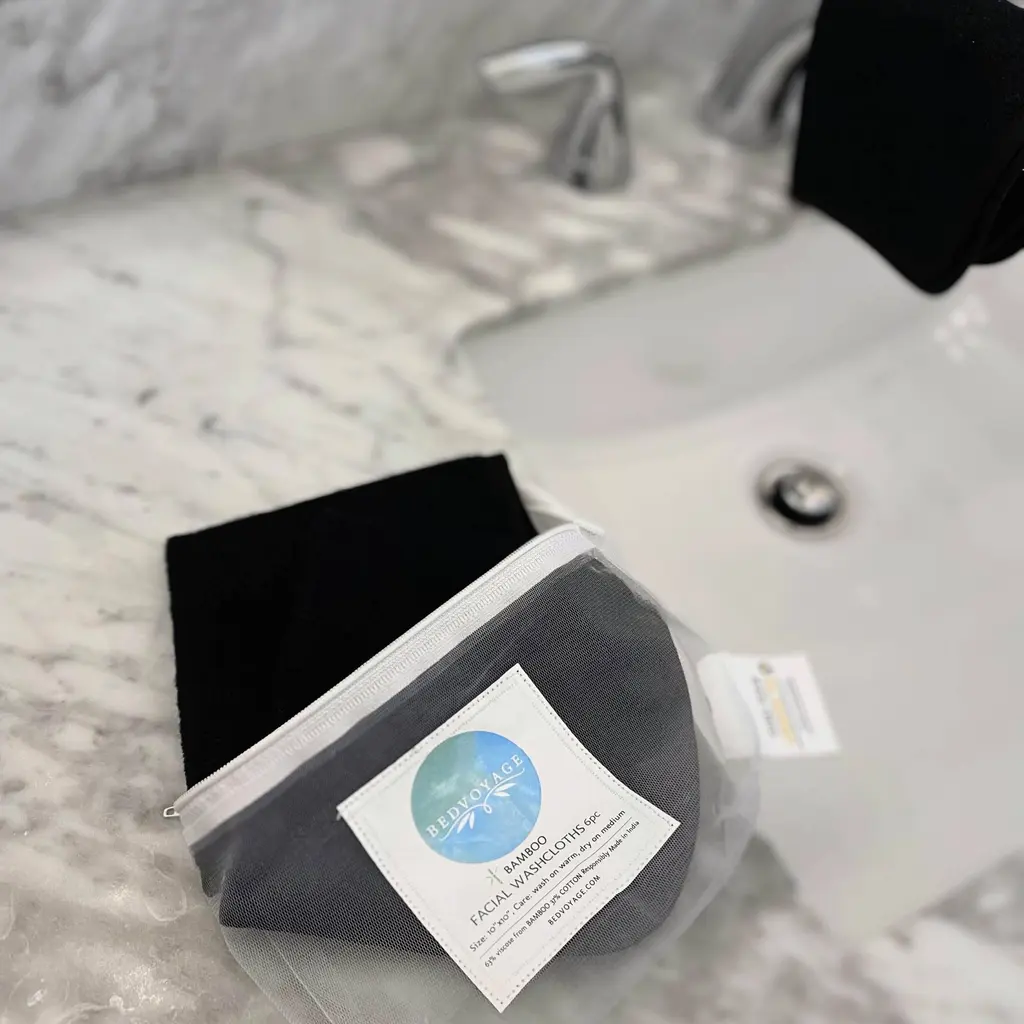 BedVoyage viscose from Bamboo Facial Washcloths are super absorbent, soothing and hypoallergenic. The perfect solution for anyone with sensitive or irritated skin, allergies, or eczema. 6 Black Facial Washcloths at 10”x10”, 500 GSM.