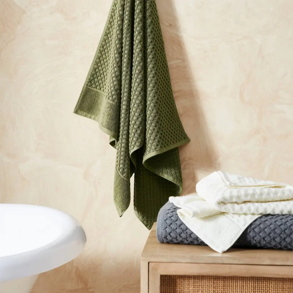 Featuring a distinct diamond texture, our towels provide not only exceptional absorbency but also ensure quick-drying thanks to their high-quality cotton composition. With an array of solid colors to choose from, you can easily create a cohesive and modern look that elevates your bathroom's aesthetic appeal. Each use will remind you of its superior quality and exceptional comfort. These towels look good, feel good, and are made well, so you can trust you're getting high-quality products. These bath towels are Standard 100 Certified by OEKO-TEX® & have been independently tested and certified free from harmful chemicals.