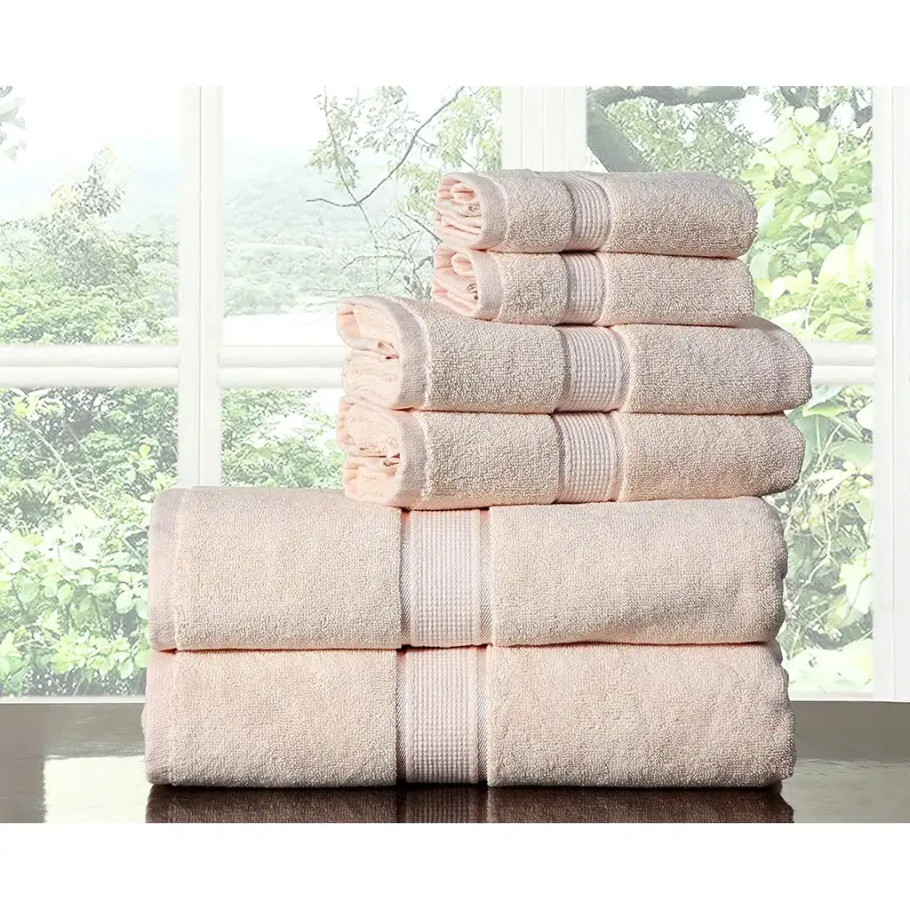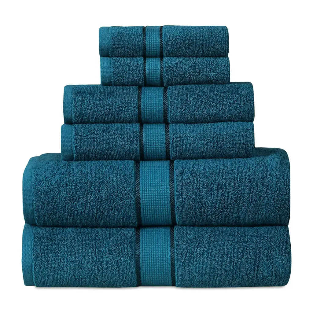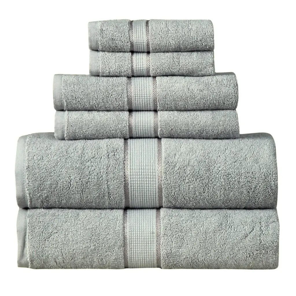 Wrap yourself in ultimate comfort with this 6 piece bathroom towel set. The set includes two plush bath towels, two hand towels, and two washcloths, all made from 100% cotton with a luxurious 600 GSM weight. These towels are fade-resistant and have maximum absorbency while also drying quickly. The double-stitched edges and dobby hem borders ensure that these towels are strong and durable. Plus, they are eco-friendly with natural dyes and are easy to care for with machine-washing and bleach-safe properties.Features:Other section: