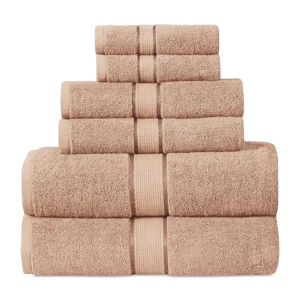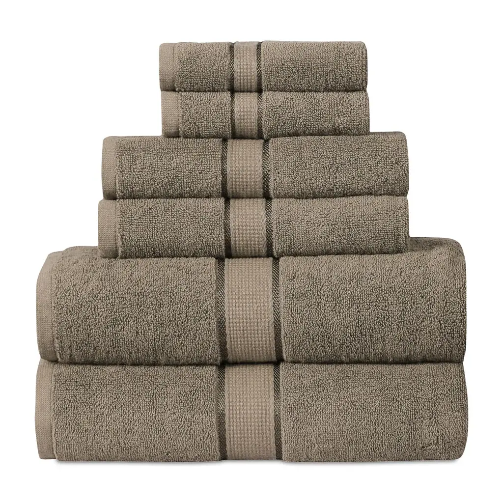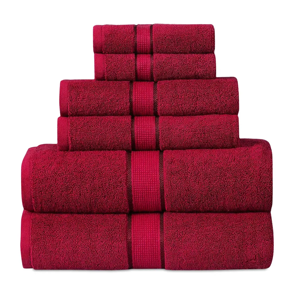 Wrap yourself in ultimate comfort with this 6 piece bathroom towel set. The set includes two plush bath towels, two hand towels, and two washcloths, all made from 100% cotton with a luxurious 600 GSM weight. These towels are fade-resistant and have maximum absorbency while also drying quickly. The double-stitched edges and dobby hem borders ensure that these towels are strong and durable. Plus, they are eco-friendly with natural dyes and are easy to care for with machine-washing and bleach-safe properties.Features:Other section: