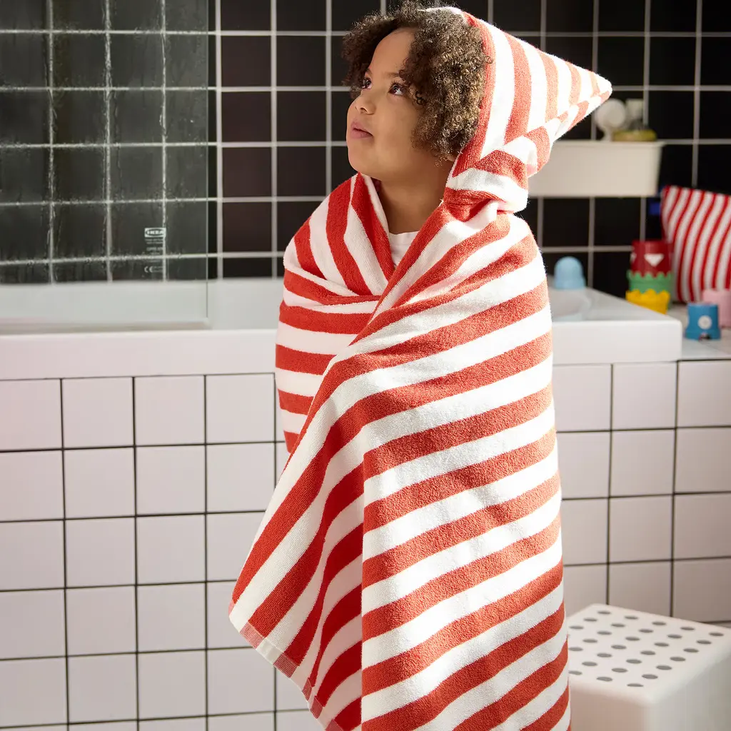 SKOGSSALLAT Towel with hood - red/white/stripe 28x55 ". Your child dries quickly with the warm embrace of this soft and absorbent bath towel with hood. Made of 100% cotton – a soft natural material that feels comfy against your child's skin. The loop makes it easy to hang on a knob or hook.