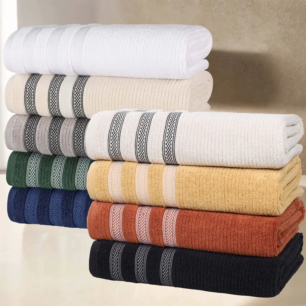 The Superior Brea Zero Twist Cotton Ribbed Face Towel Washcloth Set feels luxurious on your skin and adds texture to any space in your home. Our zero twist cotton washcloths provide durability and versatile absorption, perfect for cleaning up spills or as the ideal accessories to your daily bathroom routine. Featuring an absorbent ribbed texture with a stylish geometric border, these elegant towels are available in Gold, Rust, Stone, Black, White, Ivory, Grey, Forest Green, and navy blue color options to match your home decor style. This set of daily essentials includes 12 washcloths that can also be used as face towels. Features: