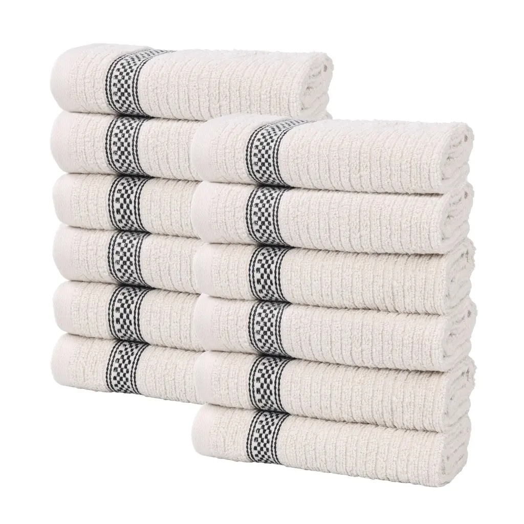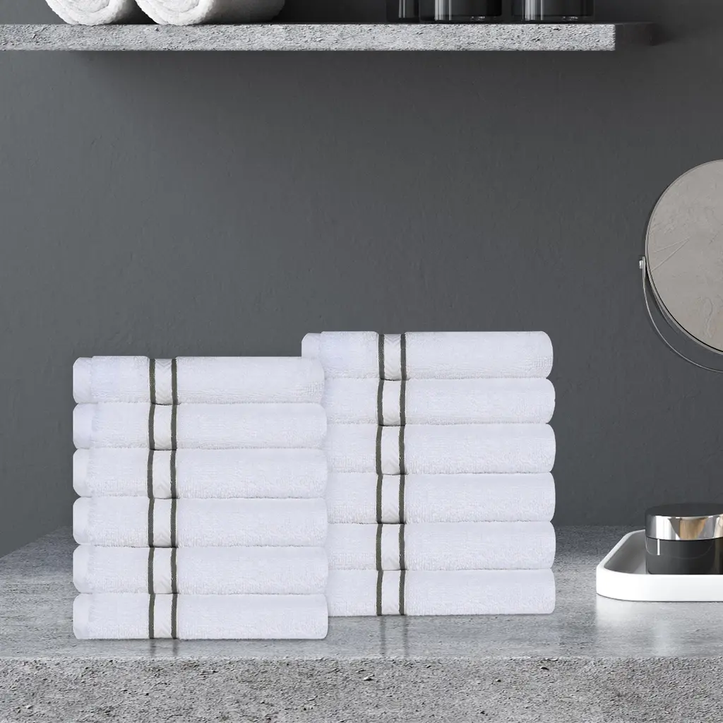 The Superior Brea Zero Twist Cotton Ribbed Face Towel Washcloth Set feels luxurious on your skin and adds texture to any space in your home. Our zero twist cotton washcloths provide durability and versatile absorption, perfect for cleaning up spills or as the ideal accessories to your daily bathroom routine. Featuring an absorbent ribbed texture with a stylish geometric border, these elegant towels are available in Gold, Rust, Stone, Black, White, Ivory, Grey, Forest Green, and navy blue color options to match your home decor style. This set of daily essentials includes 12 washcloths that can also be used as face towels. Features: