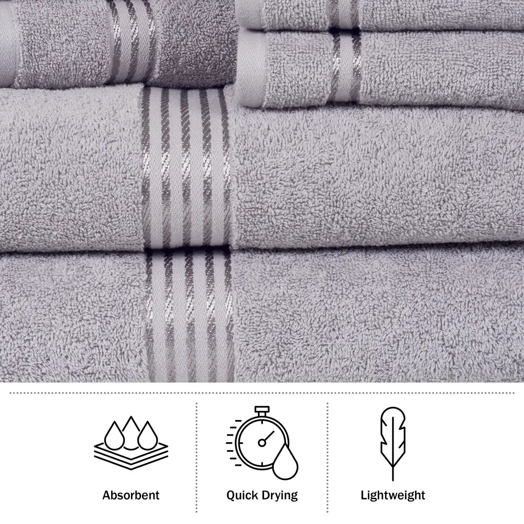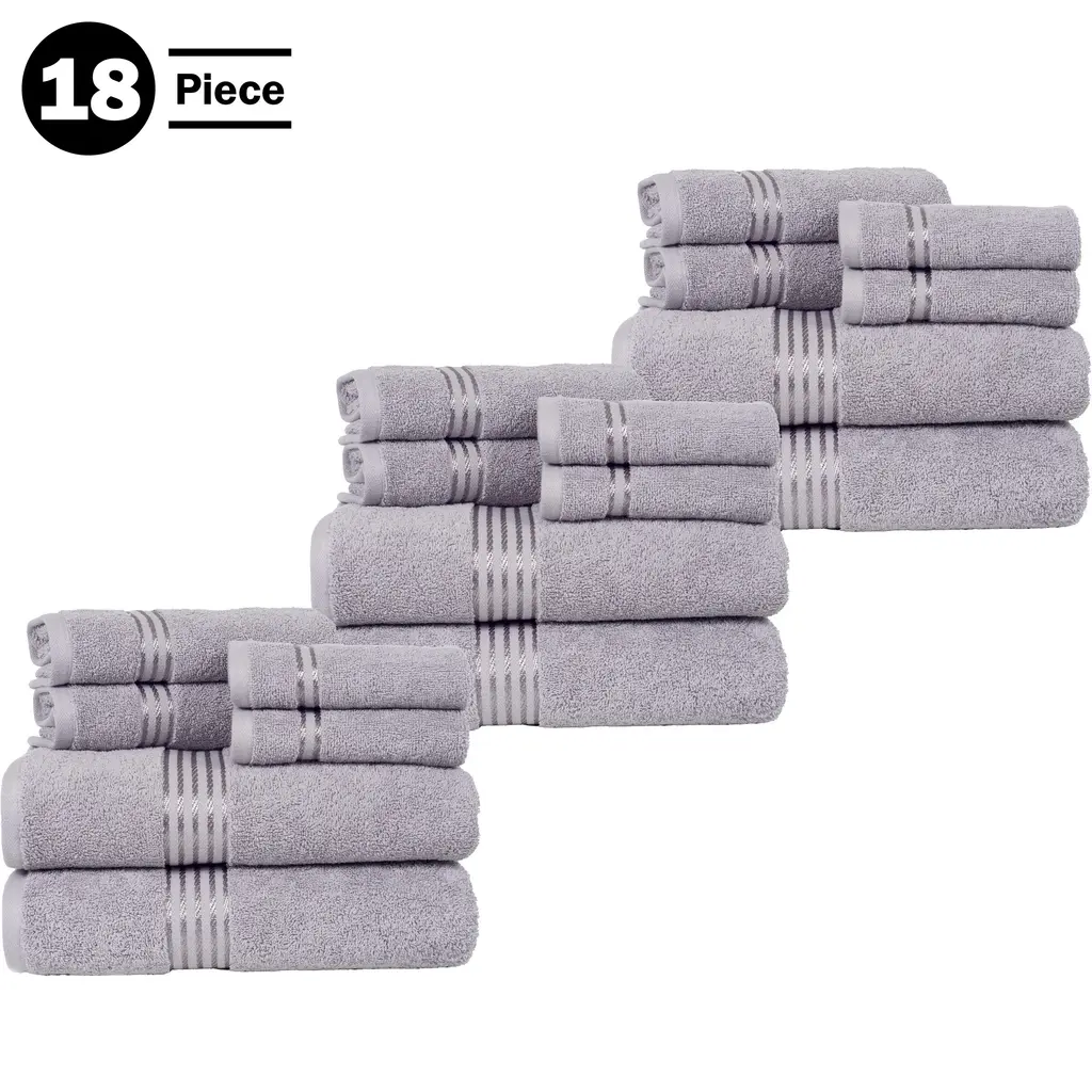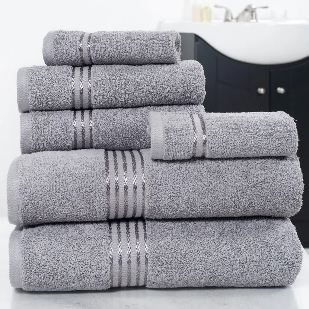 Bring spa quality luxury to the comfort of your own bathroom with the Bath Towel Set by Lavish Home. These super soft and plush towels for bathroom are made from 100-percent cotton with a pleasing terry cloth weave type that is designed for maximum absorption. The bath towels sets can be used in your primary, guest, and en suite bathroom for a cohesive look throughout your house or gift one of the towel sets as a wedding, housewarming, or back-to-school present for college students.BATH TOWEL SET - This bath towels set comes with bath towels, hand towels for bathroom, and washcloths with an understated striped detail with a glossy hue that adds depth to the look of these luxurious linens.COTTON COMFORT - Made from only the finest 625 GSM cotton with a terry cloth weave, this bathroom towel set offers excellent absorbency. The loop construction of these cotton towels helps them wick away moisture quickly, so you can start your day.SOFT AND COMFORTABLE - The bathroom towels are soft and provide plenty of warmth, all while remaining breathable, for a comfortable addition to your bathrooms. The fluffy feel of each towel will help turn your washroom into a spa-like experience.MACHINE WASHABLE - These large bath towels are machine washable for your convenience — simply wash the bathroom essentials before first use, wash warm with like colors, do not use bleach, and tumble dry low.PRODUCT DETAILS - Materials: 100% Cotton and 625 GSM. Dimensions: Bath Towel: (L) 54.5” x (W) 28”; Hand Towel: (L) 28.5” x (W) 16.5”; Washcloth: (L) 13.5” x (W) 13.5”. Made in India. Color: Gray.