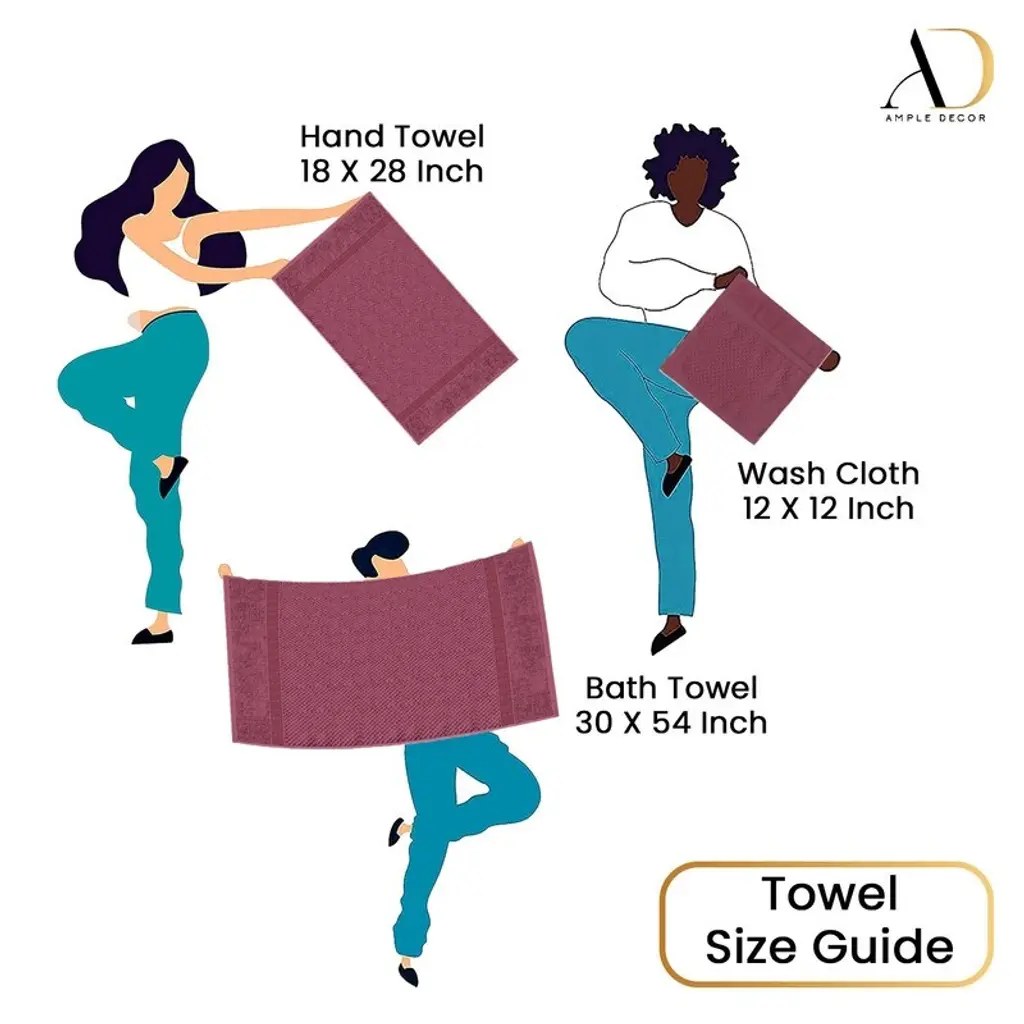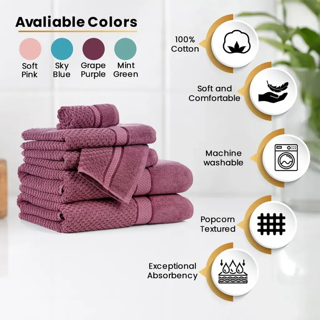 Popcorn Delight: Wrap yourself in playful comfort… Ample Decor's new Mulaayam Collection towel set with the Popcorn pattern is a fun and fashionable addition to any bathroom or kitchen. This towel is ideal for drying your hands, or even as a decorative element because it is made of soft and absorbent fabrics. The high-quality material guarantees longevity and long-lasting use, and the pattern gives your room a dash of playfulness. Our Popcorn design towels are the ideal option if you're searching for a useful towel for daily use or a statement item to liven up the look of your home. Features: - Brand: - Ample Decor Material: - 100% Cotton GSM: - 550 GSM Pattern: - Popcorn Pattern Set Content: - 4 Bath Towels, 4 Hand Towels, 10 Wash Cloths Dimension: - 30 X 54 Inch, 18 X 28 Inch, 12 X 12 Inch Wash care: - Machine Washable, do not bleach or dry clean the towel. DISCLAIMER: - Due to variations in screen settings, color profiles, and calibration, colors exhibited on electronic devices like computer displays, smartphones, or tablets may not be accurately represented. As a result, colors may not show exactly as they do on some devices.