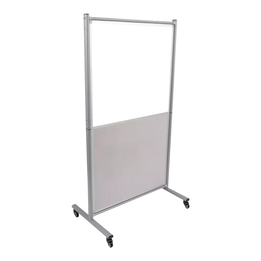 The Stand Up Desk Store Mobile Combo Magnetic Whiteboard/Tackboard/Room Divider is an incredibly versatile addition to an office or classroom environment. Depending on how you choose to use it, this double-sided dry erase board/corkboard can create privacy and separation between work stations, display notes and other paper documents, and/or serve as a presentation and collaboration tool for meetings and lessons with smaller groups. Highlights of this whiteboard partition include a 33.5" x 30.25" double-sided magnetic dry-erase whiteboard surface that resists stains and ghosting and is easy to clean with a 70% alcohol solution. Beneath is a 33.5" x 28.9" double-sided tackboard surface with a perforated magnetic cover. Lockable 2" casters make it easy to roll the divider from room to room. The aluminum inner frame mated to a powder-coated steel outer frame and base to ensure strength and durability. Overall dimensions are 38″ W x 24″ D x 70″ H. Easy assembly. 5-year limited warranty against defects. Stand Up Desk Store is based in the suburbs of Chicago.