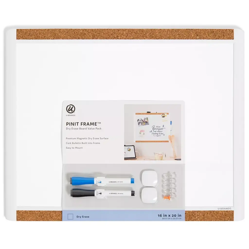 U Brands 16"x20" Pin-it Frame Magnetic Dry Erase Board Value Pack: Wall Mount Whiteboard With Magnets & Marker