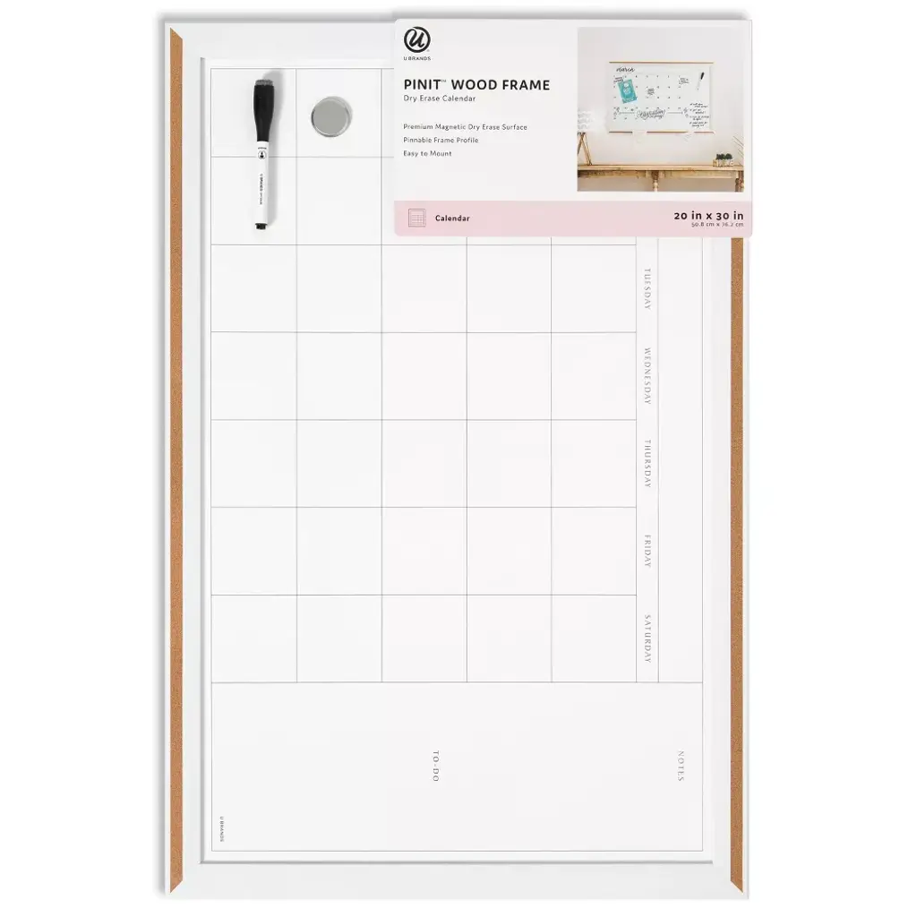 U Brands 20"x 30" Pinit Magnetic Dry Erase Calendar Board Wood Frame