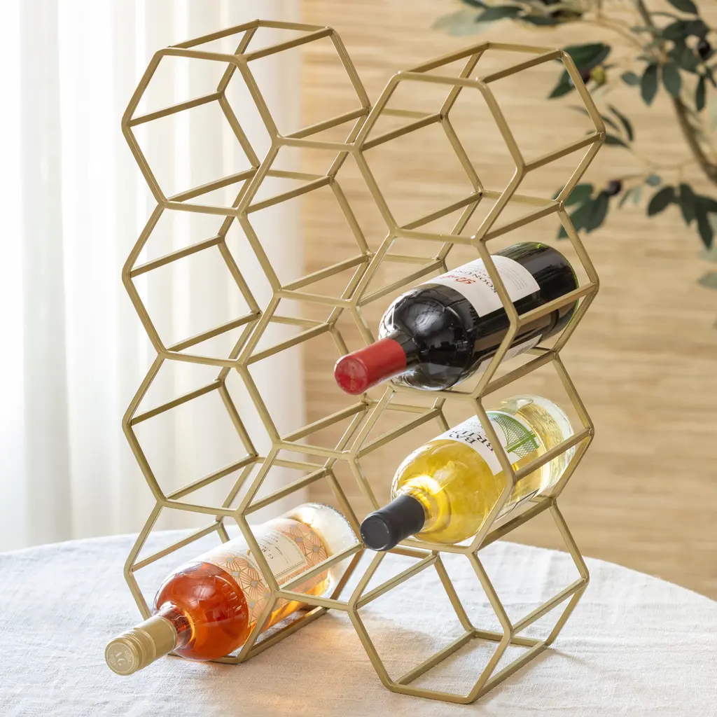 Our exclusive hexagon-shaped wine rack accommodates up to 11 bottles. Formed of durable iron rods that are hand welded into place, the rack has a shiny graphite finish. Beautiful on the kitchen countertop, wine cabinet or bar, the rack can be positioned vertically or horizontally.