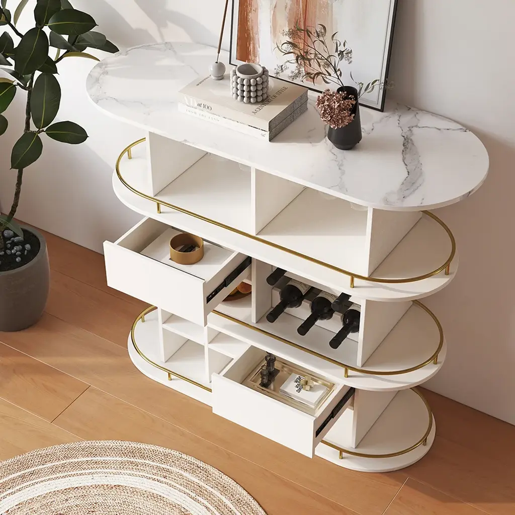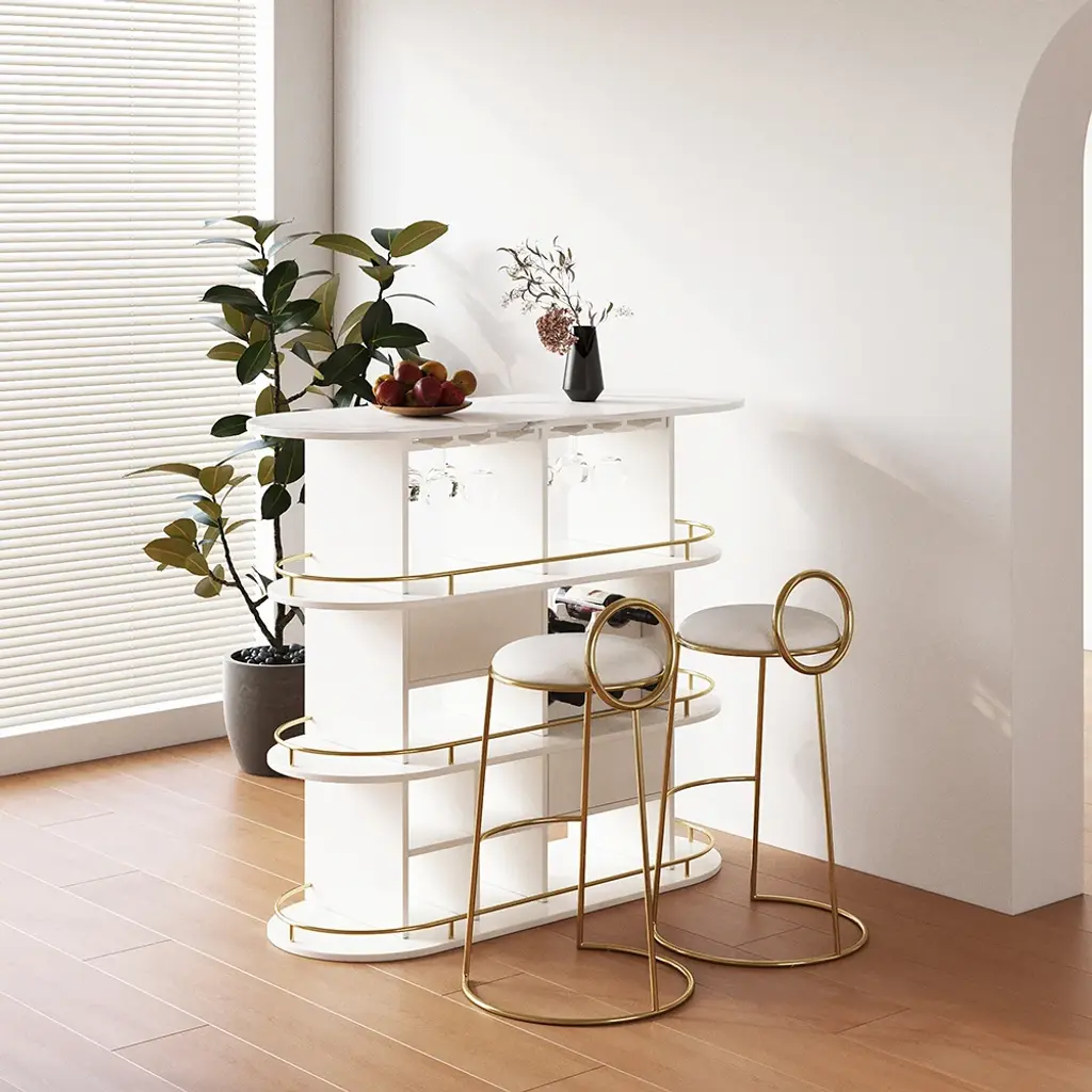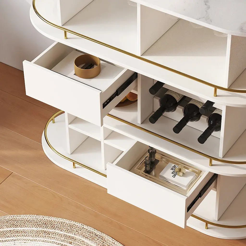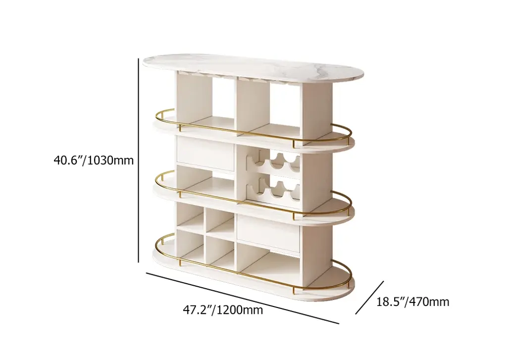 47" White Oval Bar Table With Wine Rack Glass Holder Liquor Tier Storage 2-Drawer