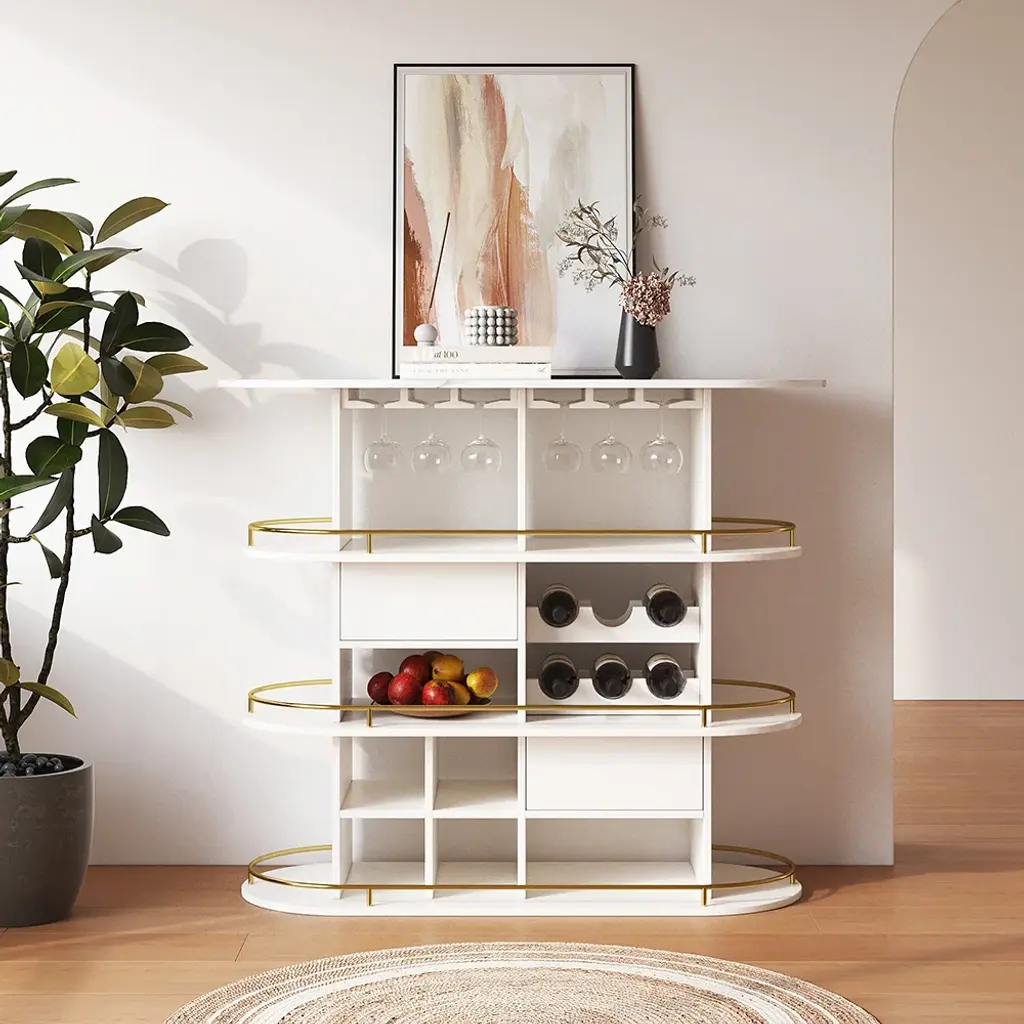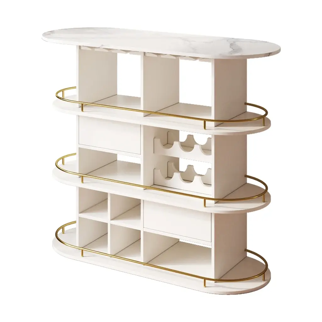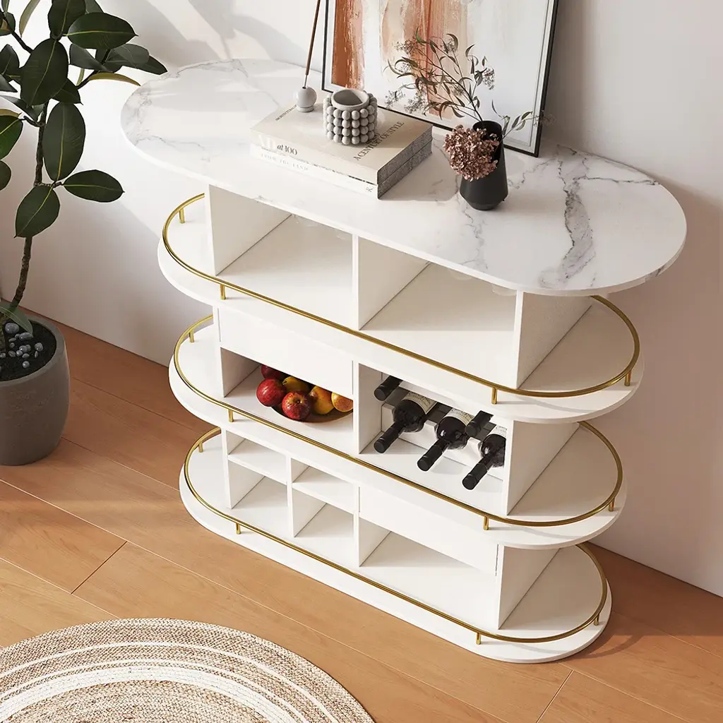 47" White Oval Bar Table With Wine Rack Glass Holder Liquor Tier Storage 2-Drawer