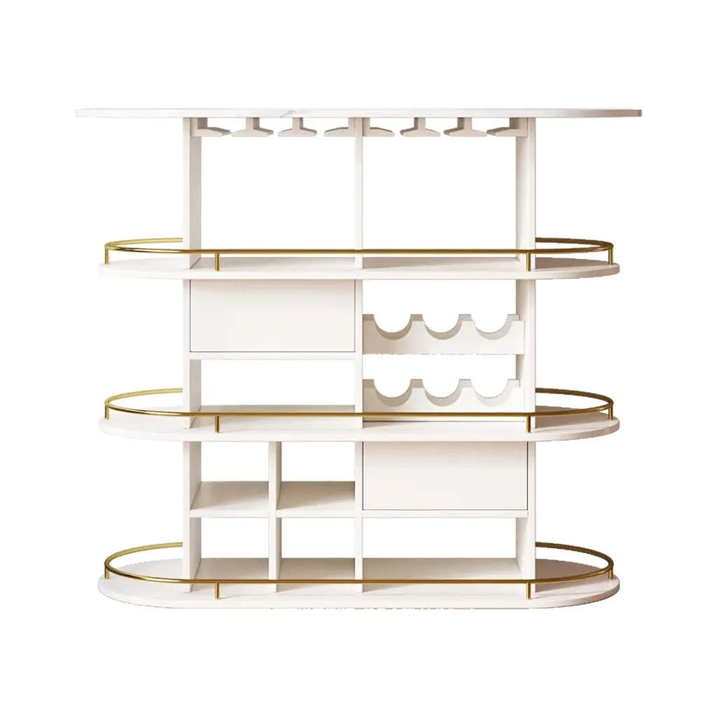 Add stylish beverage storage to your dining room or living space with this functional bar table. An elongated tabletop provides plenty of space for mixing drinks, while the artistic texture adds a modern feel to your décor. 6 rows of wine glass holders, wine bottle storage, and open shelves organize stemware, spirits, and mixers, keeping your entertaining space neat and tidy. Inside, Lipped ledge shelves keep the contents secure. Moreover, the bar table also has 2 drawers that can be used to keep your small yet necessary items. Constructed from quality MDF, it will give years of service and timeless elegance.