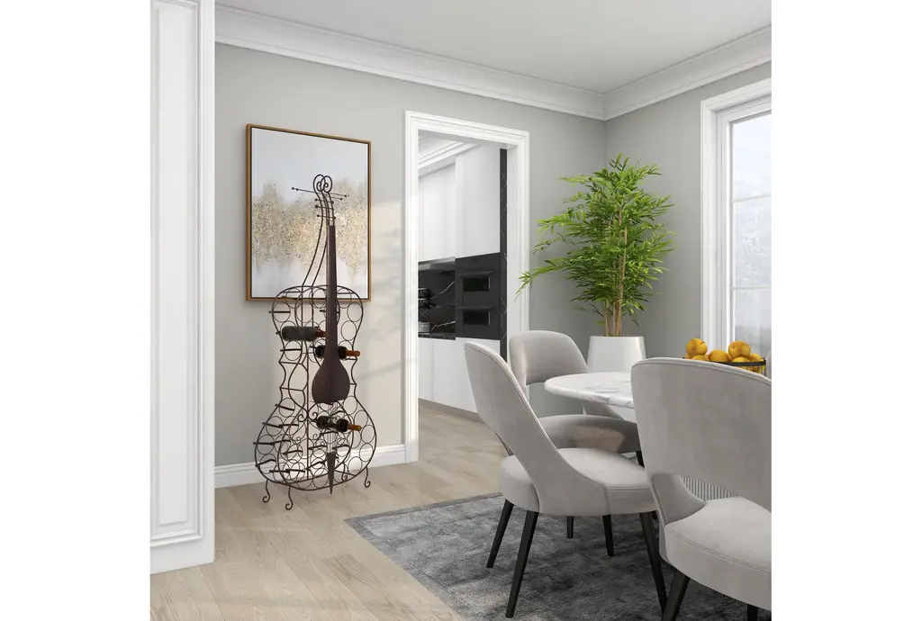 Bring the all-black finish to life by placing this cello-shaped wine rack next to potted plants and decorative birdcages. This item ships in 1 carton. Suitable for indoor use only. This item ships fully assembled in one piece. Maximum weight limit is 100 lbs. This is a single black colored floor wine rack. Eclectic style. Black standing wine rack can hold 26 average wine bottles.