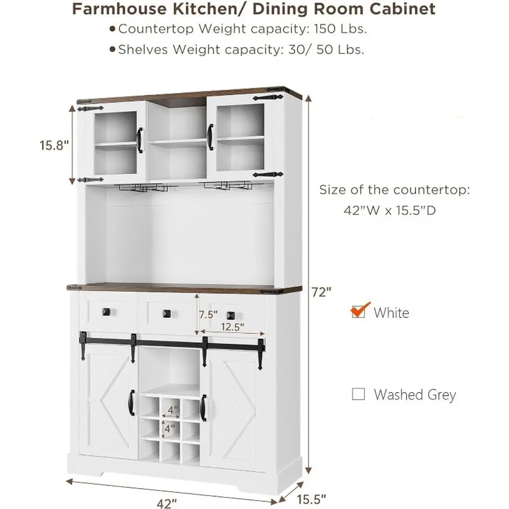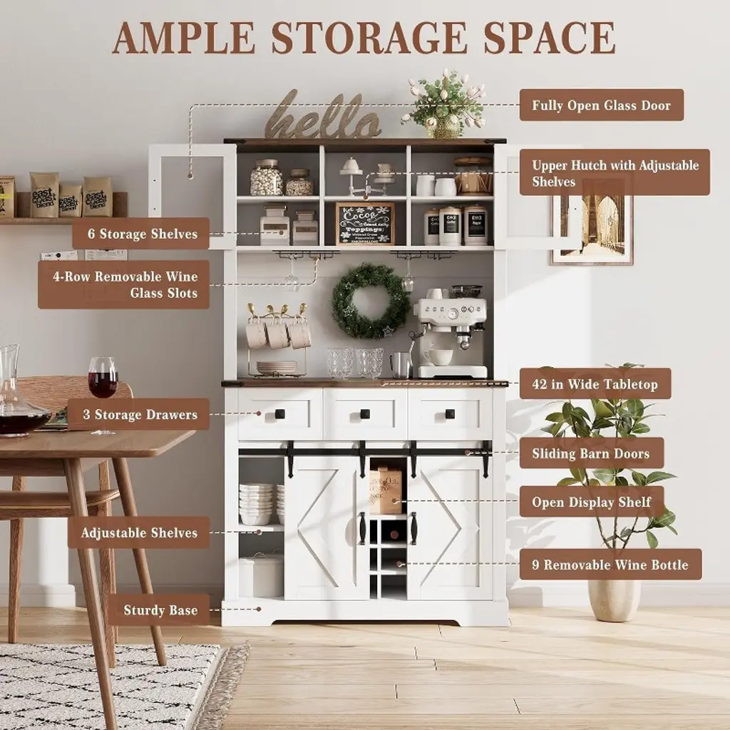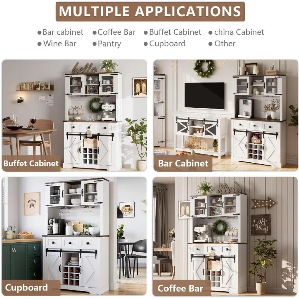 Bring rustic charm and multifunctional storage to your home with this 72" tall farmhouse bar cabinet. Designed with a sliding barn door, this tall kitchen hutch offers versatile display and concealed storage options in one elegant piece. The upper hutch features two open shelves and four shelves behind glass doors for showcasing dishes or décor. Three spacious drawers help organize utensils or linens, while built-in racks hold 12 wine bottles and multiple glasses. Two large side cabinets offer even more room for organizing essentials. Crafted from durable engineered wood with a wear-resistant surface, this unit is ideal as a wine bar, coffee station, or kitchen buffet cabinet. It’s both a striking statement and a functional solution for your kitchen, dining room, or living room.