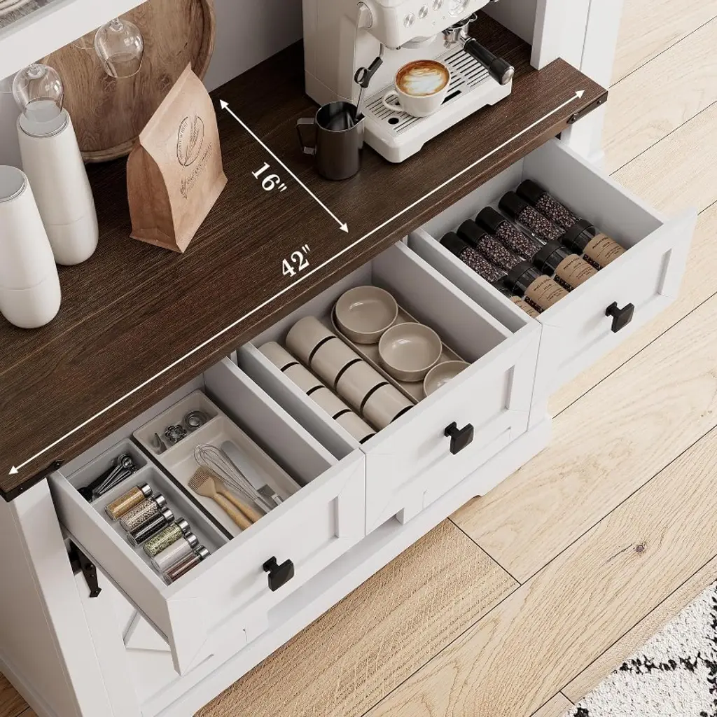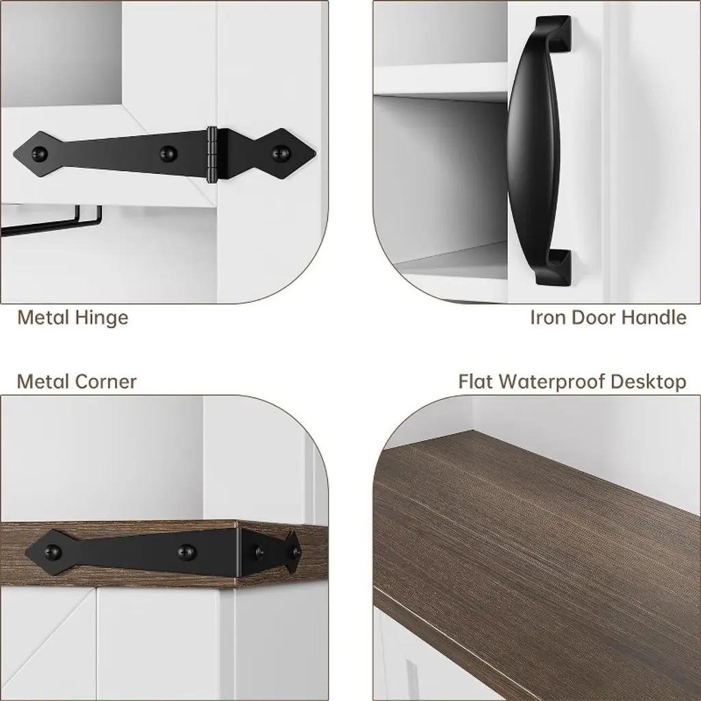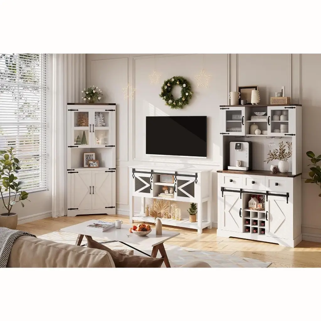 Bring rustic charm and multifunctional storage to your home with this 72" tall farmhouse bar cabinet. Designed with a sliding barn door, this tall kitchen hutch offers versatile display and concealed storage options in one elegant piece. The upper hutch features two open shelves and four shelves behind glass doors for showcasing dishes or décor. Three spacious drawers help organize utensils or linens, while built-in racks hold 12 wine bottles and multiple glasses. Two large side cabinets offer even more room for organizing essentials. Crafted from durable engineered wood with a wear-resistant surface, this unit is ideal as a wine bar, coffee station, or kitchen buffet cabinet. It’s both a striking statement and a functional solution for your kitchen, dining room, or living room.
