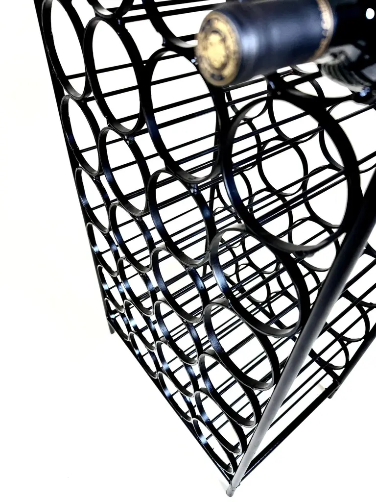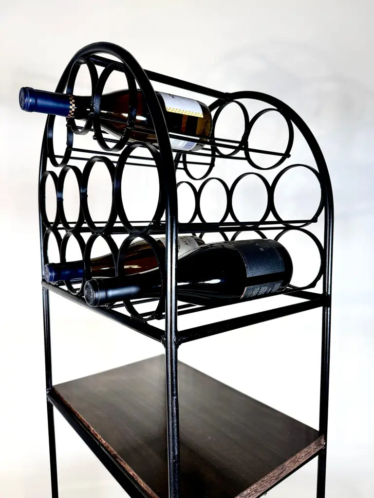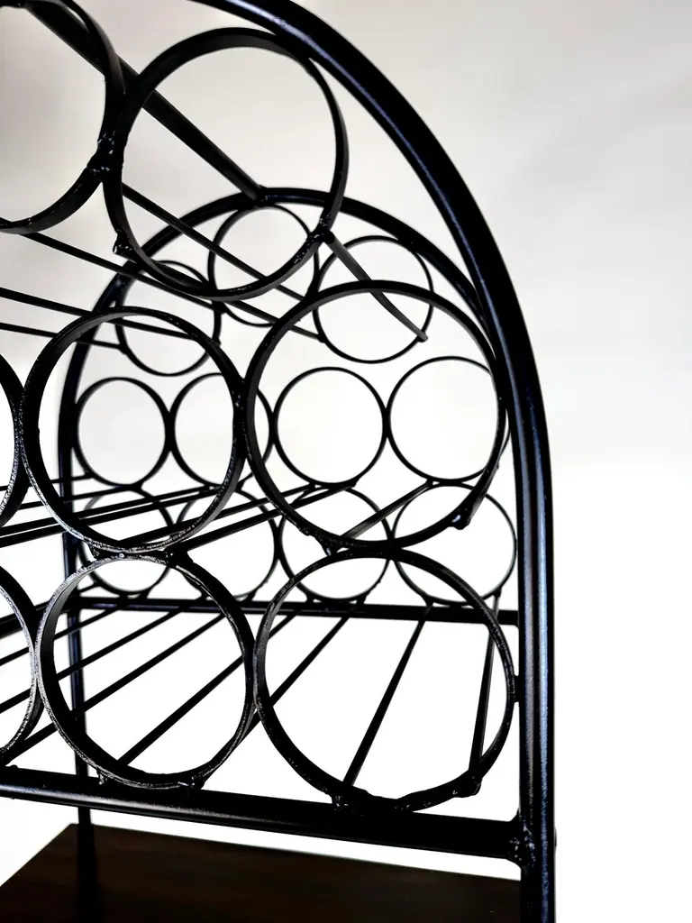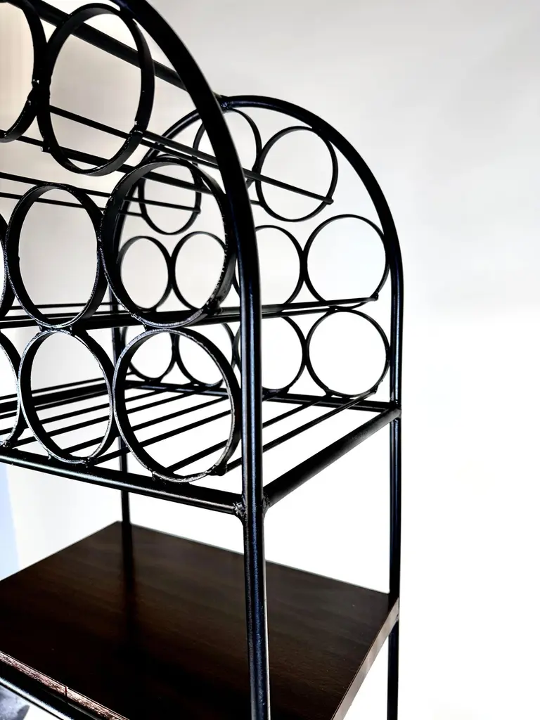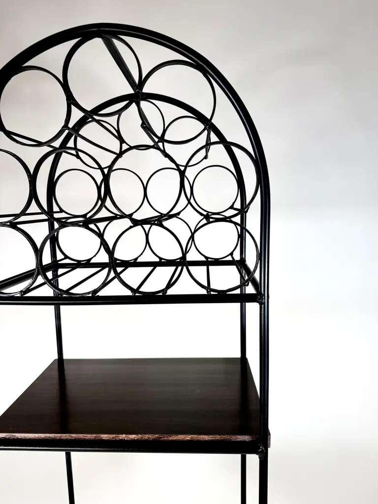 Arthur Umanoff Iron & Rattan Wine Rack with ShelvesA sculptural and highly functional piece by celebrated American designer Arthur Umanoff, this vintage wine rack showcases his signature blend of modernist form and natural materials. Crafted from powder-coated wrought iron with circular wine bottle cradles, the piece holds both visual and structural presence.The rack features two distinct shelves: a top surface made of laminated wood framed in woven rattan, ideal for display or serving, and a lower woven rattan shelf offering warm texture and utility. The arched silhouette and repeated circle motif make this not just a storage piece, but a striking focal point.Ideal for use as a wine bar, display piece, or functional sculpture, it captures the easy sophistication of mid-century casual entertaining.Designer: Arthur UmanoffOrigin: USA, 1960sMaterials: Wrought iron, rattan, laminate woodDimensions: Coming soonCondition: Excellent vintage condition with light, age-appropriate patinaDimensions: 72" H x 17"W x 12" D