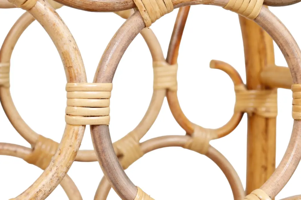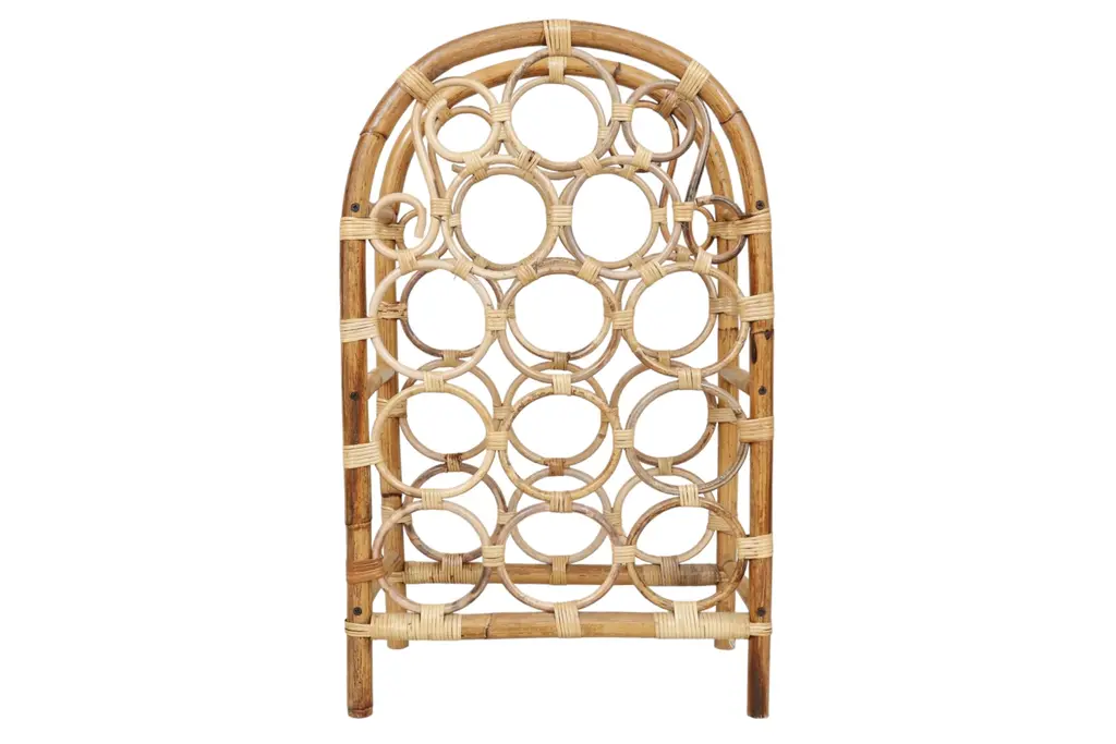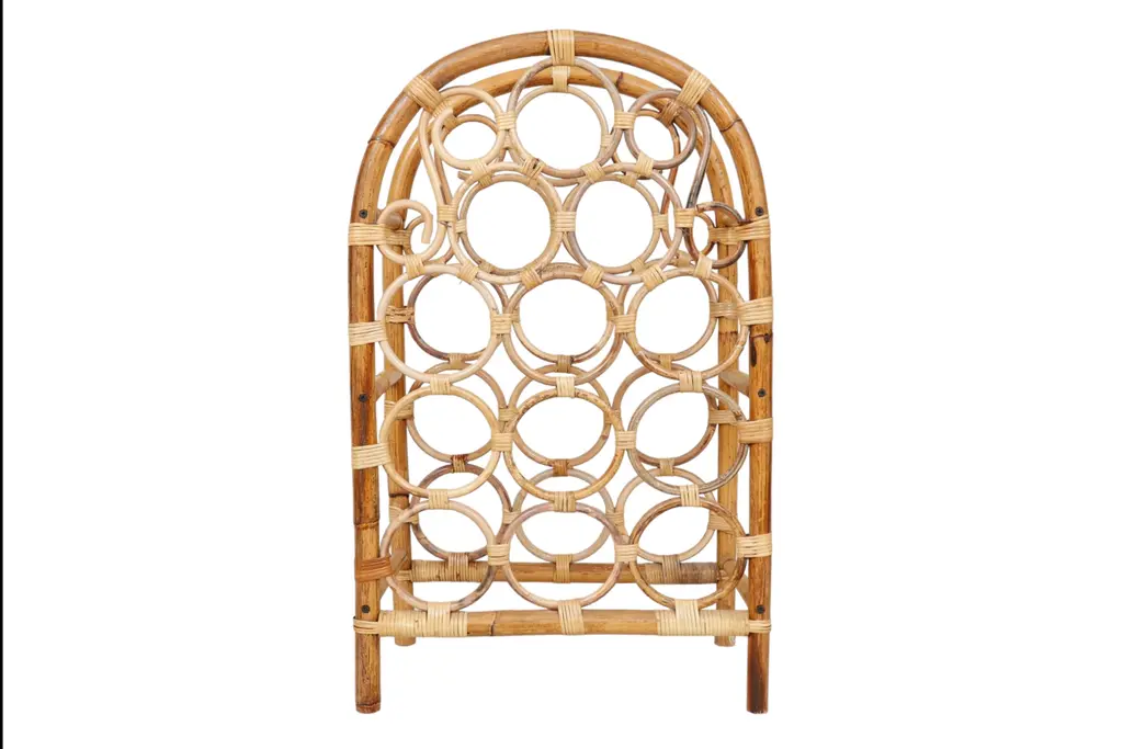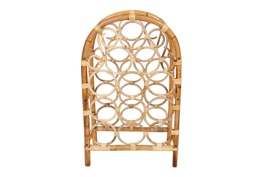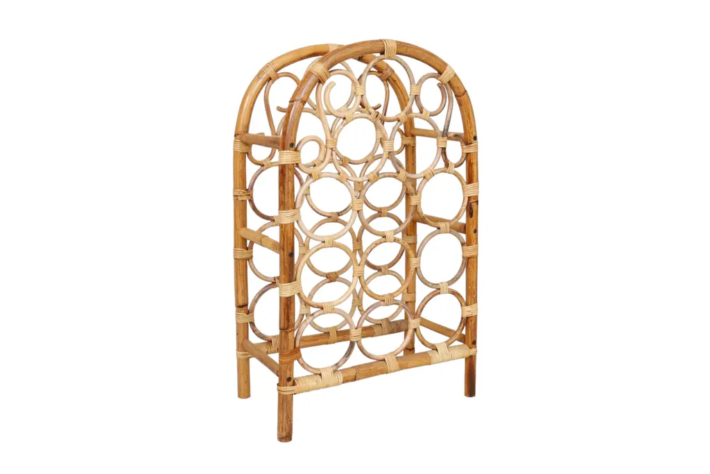 A bamboo and rattan arch shaped wine rack, designed to hold twelve bottles of wine. Pencil wood circles are secured with rattan wrapping stacked three over nine, decorated with pencil wood s-scrolls at the top.