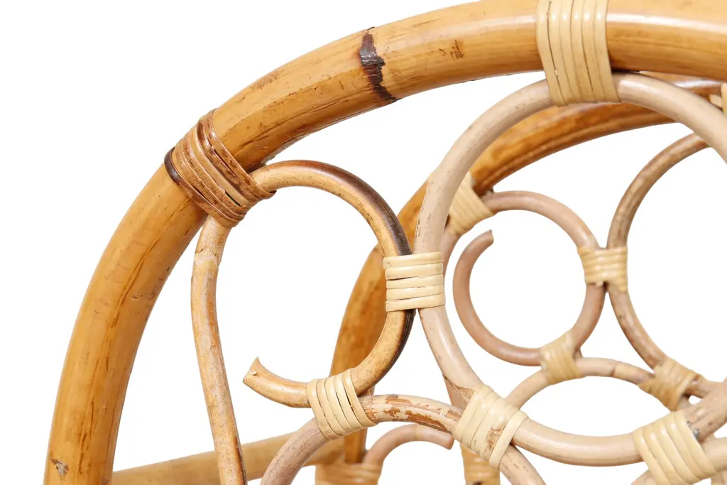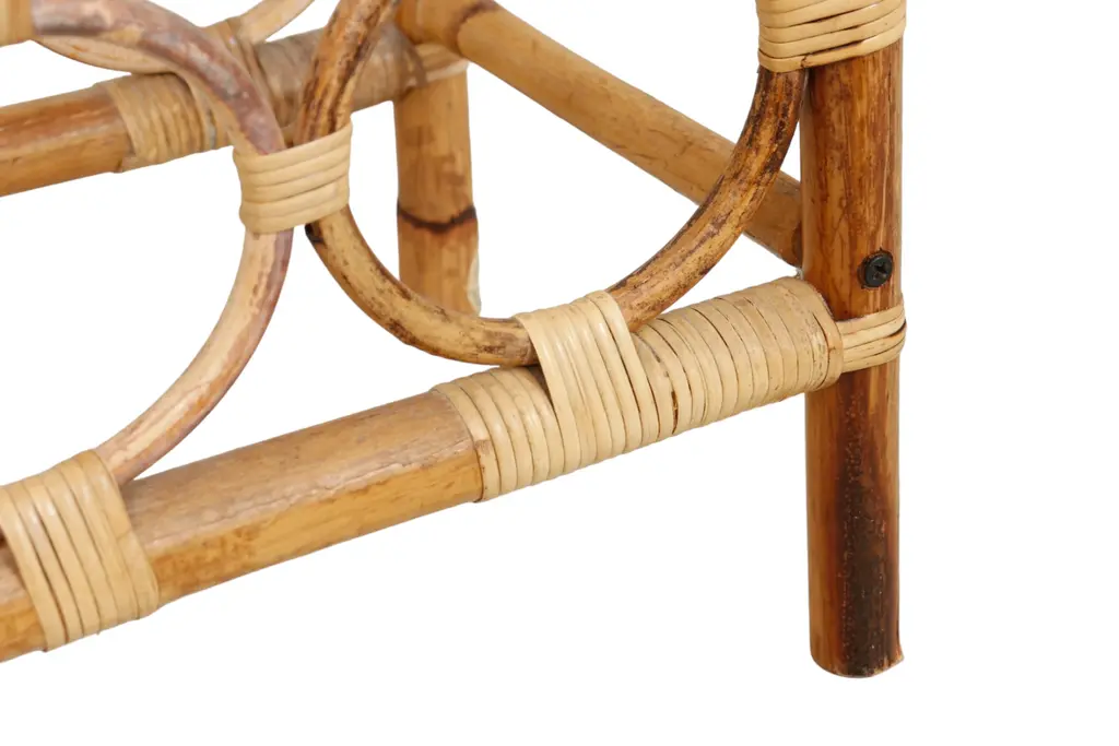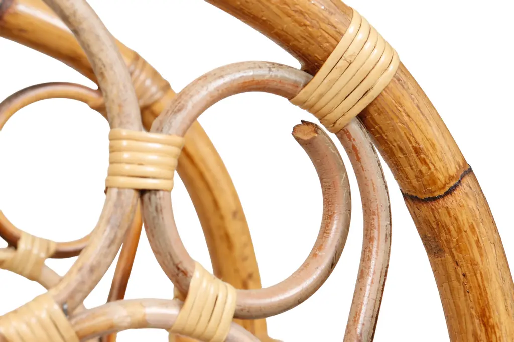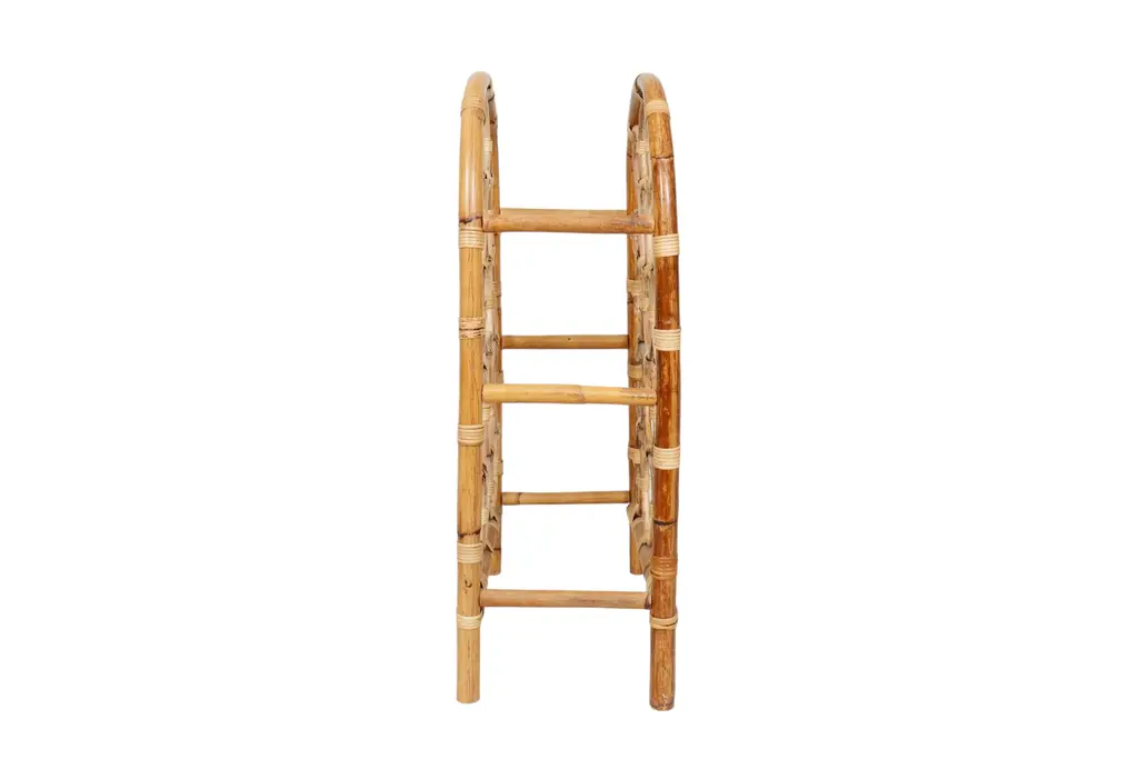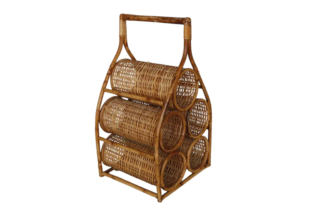 A bamboo and rattan arch shaped wine rack, designed to hold twelve bottles of wine. Pencil wood circles are secured with rattan wrapping stacked three over nine, decorated with pencil wood s-scrolls at the top.