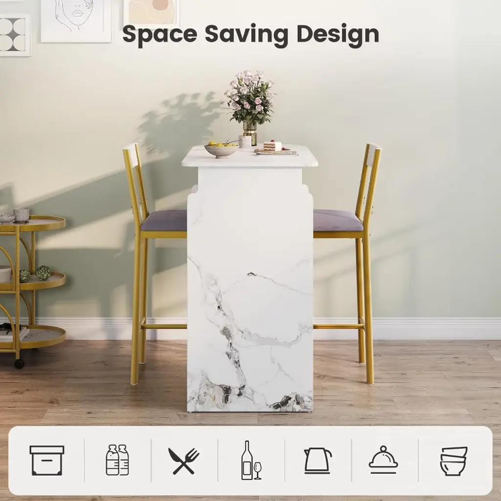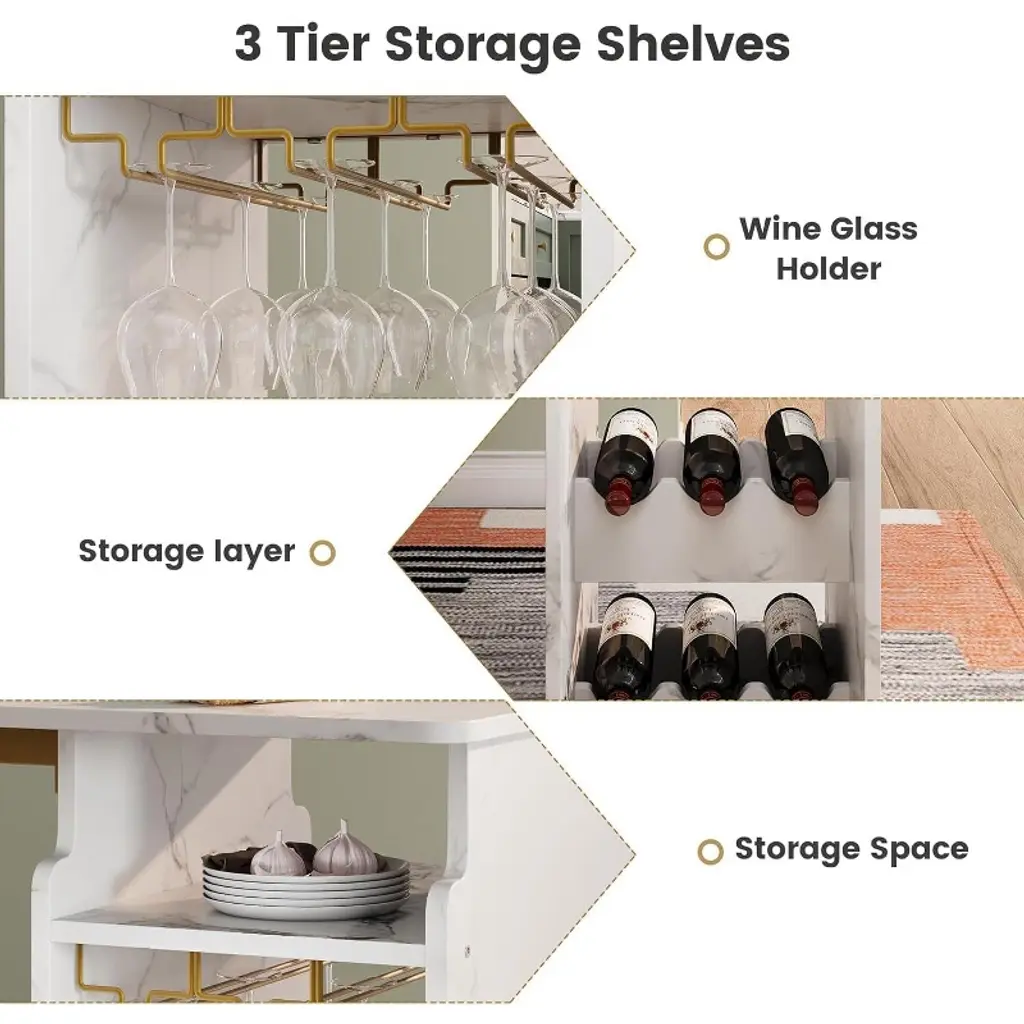 Transform your entertaining space with this Modern Bar Table and Chairs Set with Built-In Wine Rack - the ultimate all-in-one solution for stylish hosting and smart storage. The multi-functional design features three spacious storage shelves for bar accessories, a dedicated wine bottle rack, and a convenient hanging stemware holder to keep your glassware secure yet visible. Crafted with a sturdy metal frame and durable tabletop, this set combines contemporary style with lasting quality. The compact footprint makes it perfect for small kitchens, dining areas, or as a dedicated home bar station. Two matching stools with comfortable padded seats complete the set, providing cozy seating for guests.