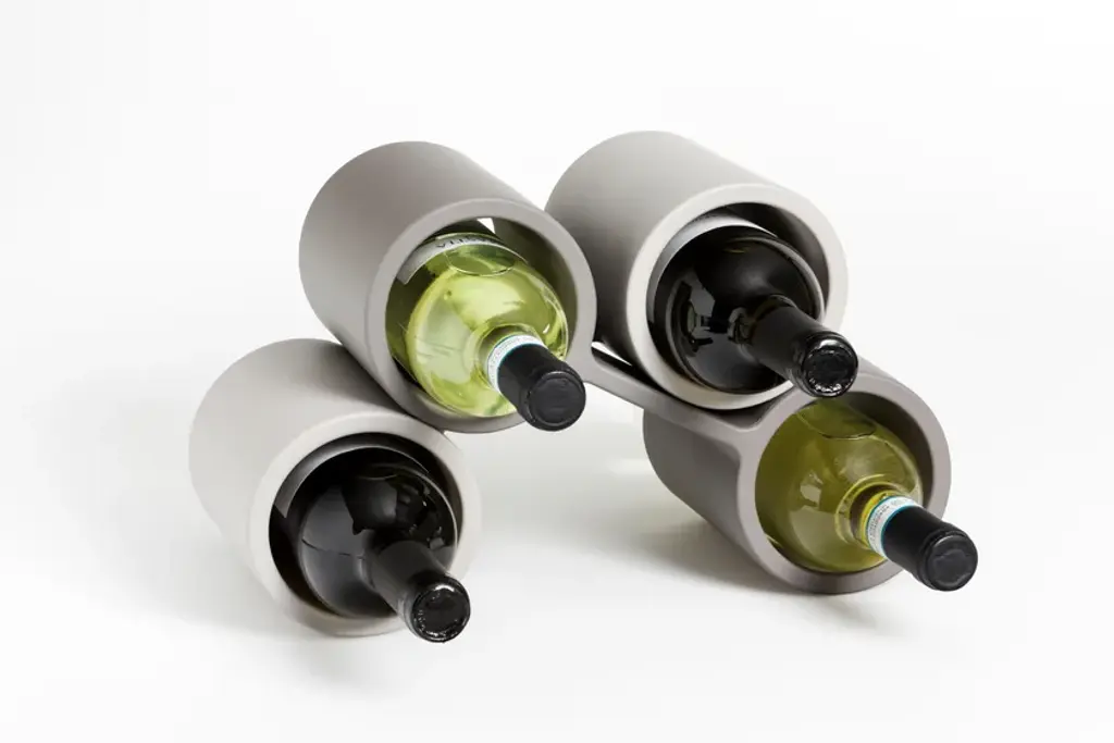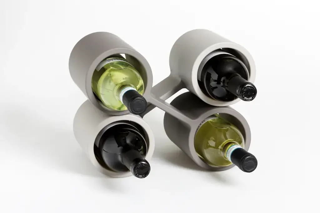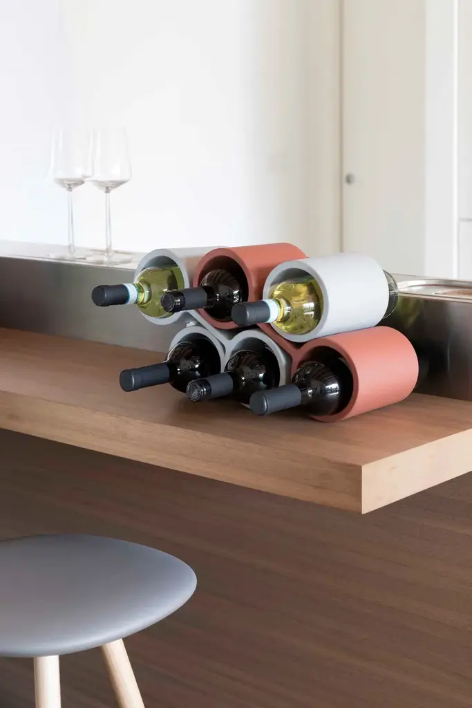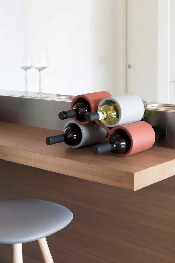 Bigovino is a bottle holder that can be used individually (for two bottles) or by inserting the elements one into the other to hold four or six bottles.Bigovino is made of soft and colored integral polyurethane which by its nature also has thermal insulation properties.The colors in which Bigovino is proposed are mustard, forest green, black, sand, terracotta and dove gray.Available from January 2021