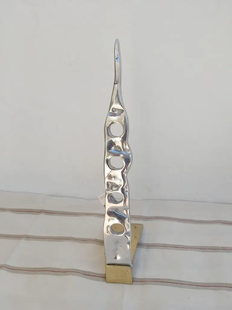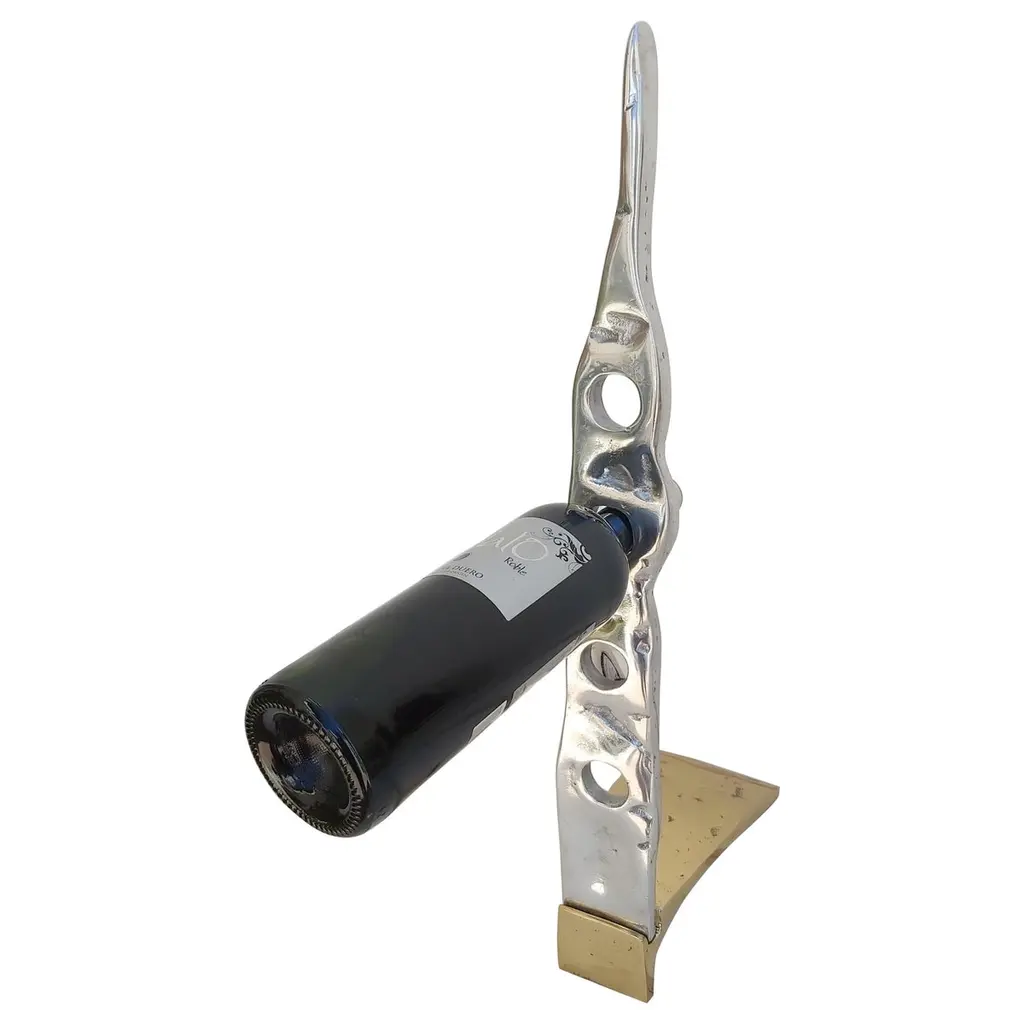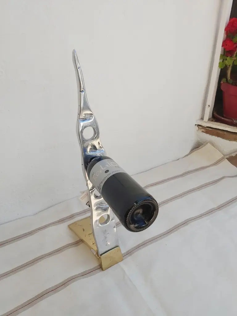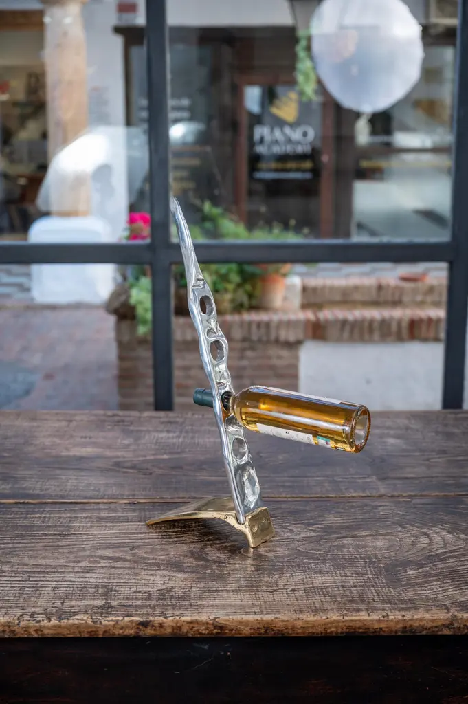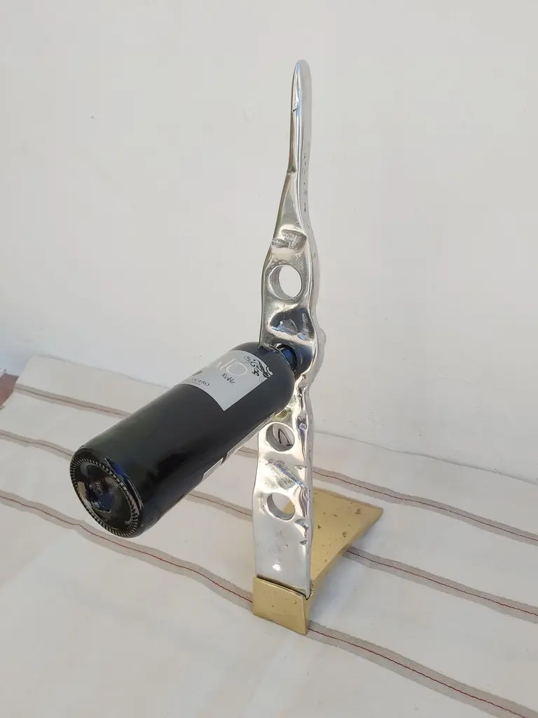 The Bottle rack was created by David Marshall, from sand cast aluminium. We use recycled materials all our pieces are handmade, mounted and finished in our foundry and workshop in Spain.It is certified authentic by the Artist David Marshall.He is insipired by nature and the landscaps making useful art with cast brass and alumium materials.We also make bespoke designs for clients, like signage for condominums,private homes, Hotels & Restaurants , awards for Charity Foundations, like Global Gift, bespoke awards for insurance companies with there logo and golf trophies for Golf Clubs like Finca Cortesin where the important Solheim Cup 2023 golf Tournment will take place.One of the qualities of any Sculpture and decorative design lies in the ability to bring its surrounding space into order.