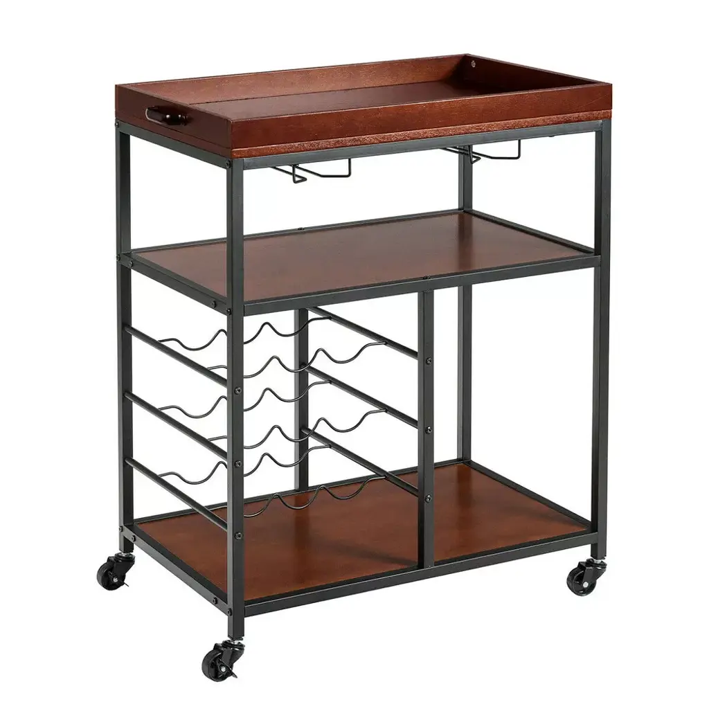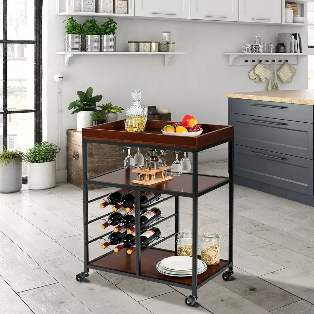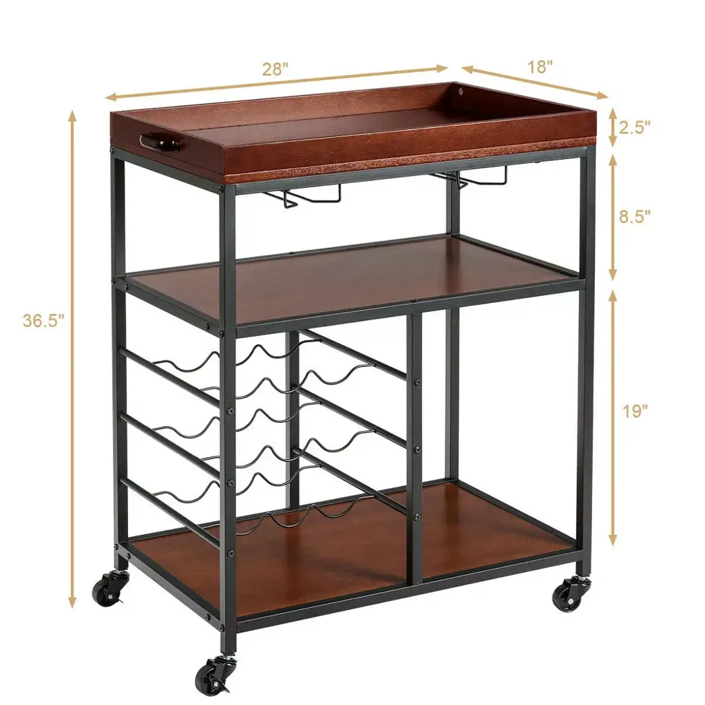 Our industrial kitchen cart brings you convenient life experience! Made of high-quality wood board and sturdy metal frame, the cart is extremely durable with greater bearing capacity. The three-tier structure provides a lot of storage space, and you can place items layer by layer according to your needs. With two-row wine cup holder and three-layer wine rack, the cart makes kitchen more organized. Equipped with 4 rolling casters, it's easy to move in the kitchen. It is ideal for kitchen, bars, restaurants and more.Features3 shelves provide ample storage space Guardrails prevent the bottle from falling on the floor Two lockable casters provide stability when stopping Wine racks and glass holders for hanging wine bottles and cups respectively Made of high-quality wood board and metal frame to ensure stability and durability Easy to assemble and easy to cleanColor: Brown Material: Particle board+ Iron Product Dimension: 28'' x 18'' x 36.5''(L x W x H) Total Weight Capacity: 44 lbs Weight Capacity of Top Shelf: 22 lbs Weight Capacity of Next Two Shelf: 11 lbs each Net Weight: 39 lbs Package includes: 1 x Kitchen Trolley Cart 1 x Instruction