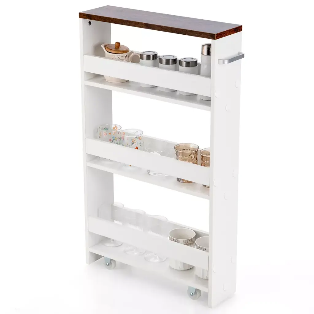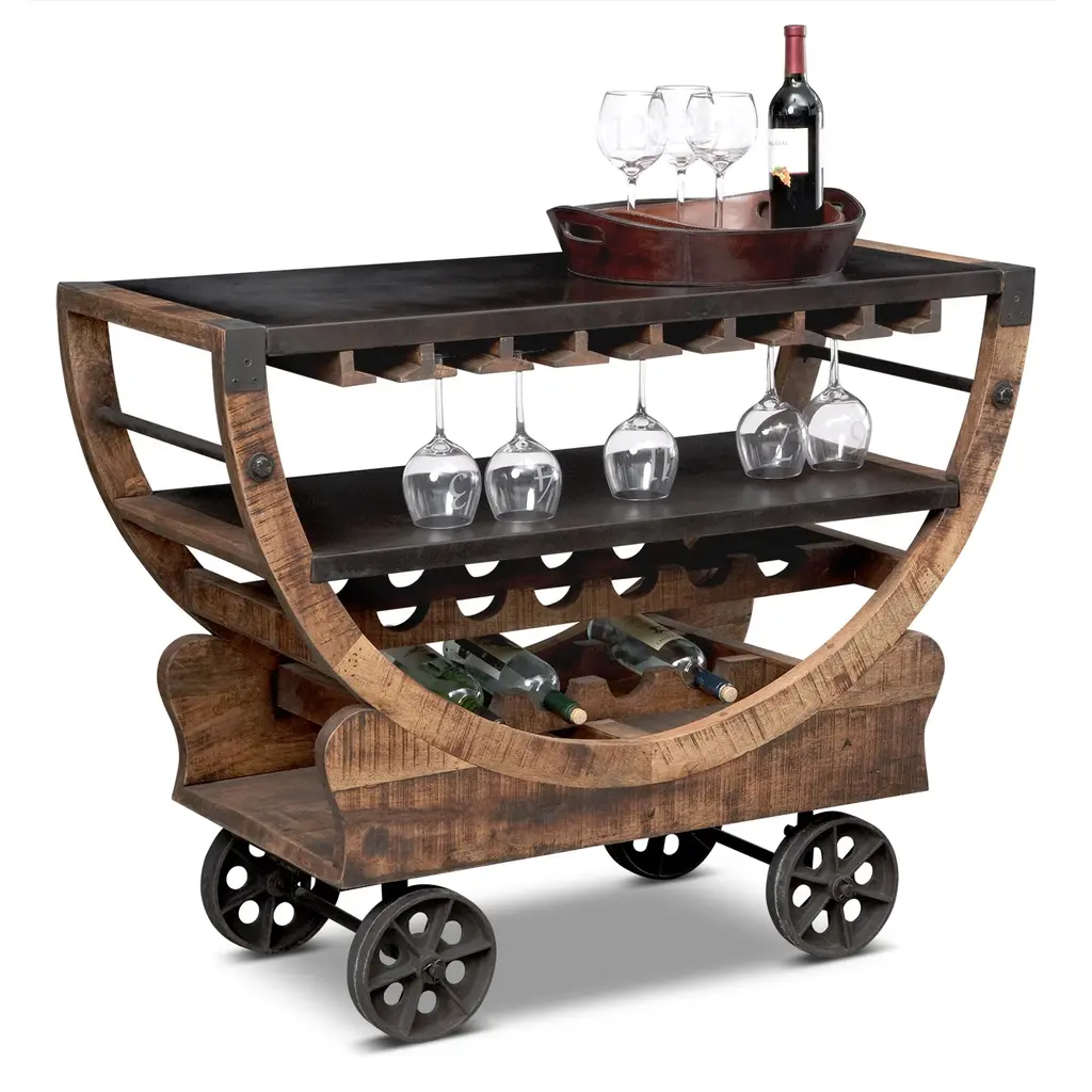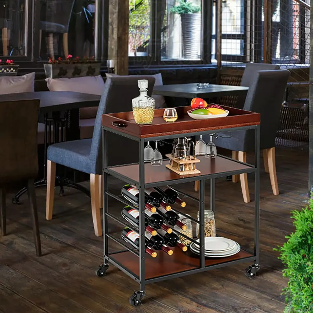 Our industrial kitchen cart brings you convenient life experience! Made of high-quality wood board and sturdy metal frame, the cart is extremely durable with greater bearing capacity. The three-tier structure provides a lot of storage space, and you can place items layer by layer according to your needs. With two-row wine cup holder and three-layer wine rack, the cart makes kitchen more organized. Equipped with 4 rolling casters, it's easy to move in the kitchen. It is ideal for kitchen, bars, restaurants and more.Features3 shelves provide ample storage space Guardrails prevent the bottle from falling on the floor Two lockable casters provide stability when stopping Wine racks and glass holders for hanging wine bottles and cups respectively Made of high-quality wood board and metal frame to ensure stability and durability Easy to assemble and easy to cleanColor: Brown Material: Particle board+ Iron Product Dimension: 28'' x 18'' x 36.5''(L x W x H) Total Weight Capacity: 44 lbs Weight Capacity of Top Shelf: 22 lbs Weight Capacity of Next Two Shelf: 11 lbs each Net Weight: 39 lbs Package includes: 1 x Kitchen Trolley Cart 1 x Instruction