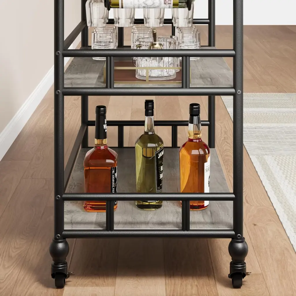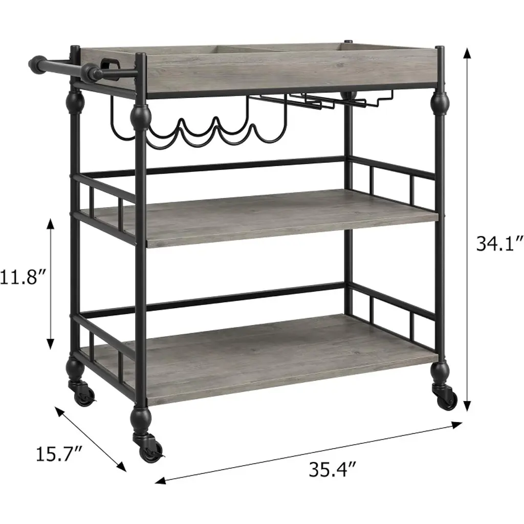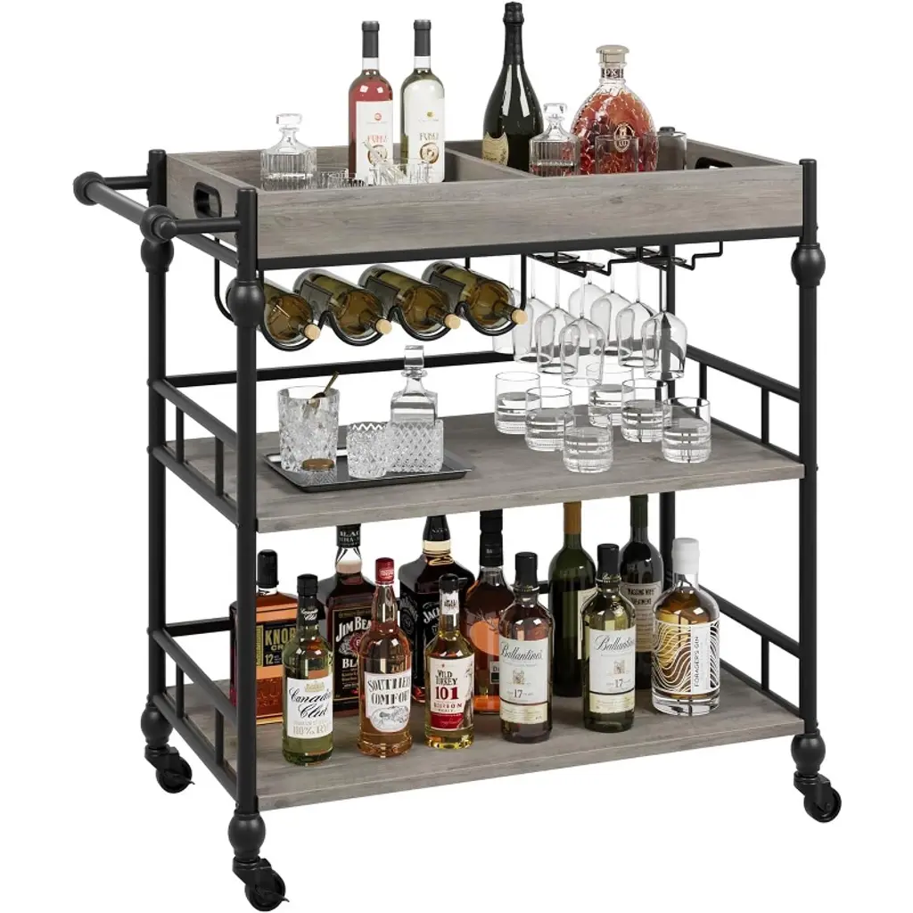 Coucheta 3-tier Industrial Bar Cart With Wine Rack & Glass Holder, Rolling Serving Cart With Removable Tray, Gray
