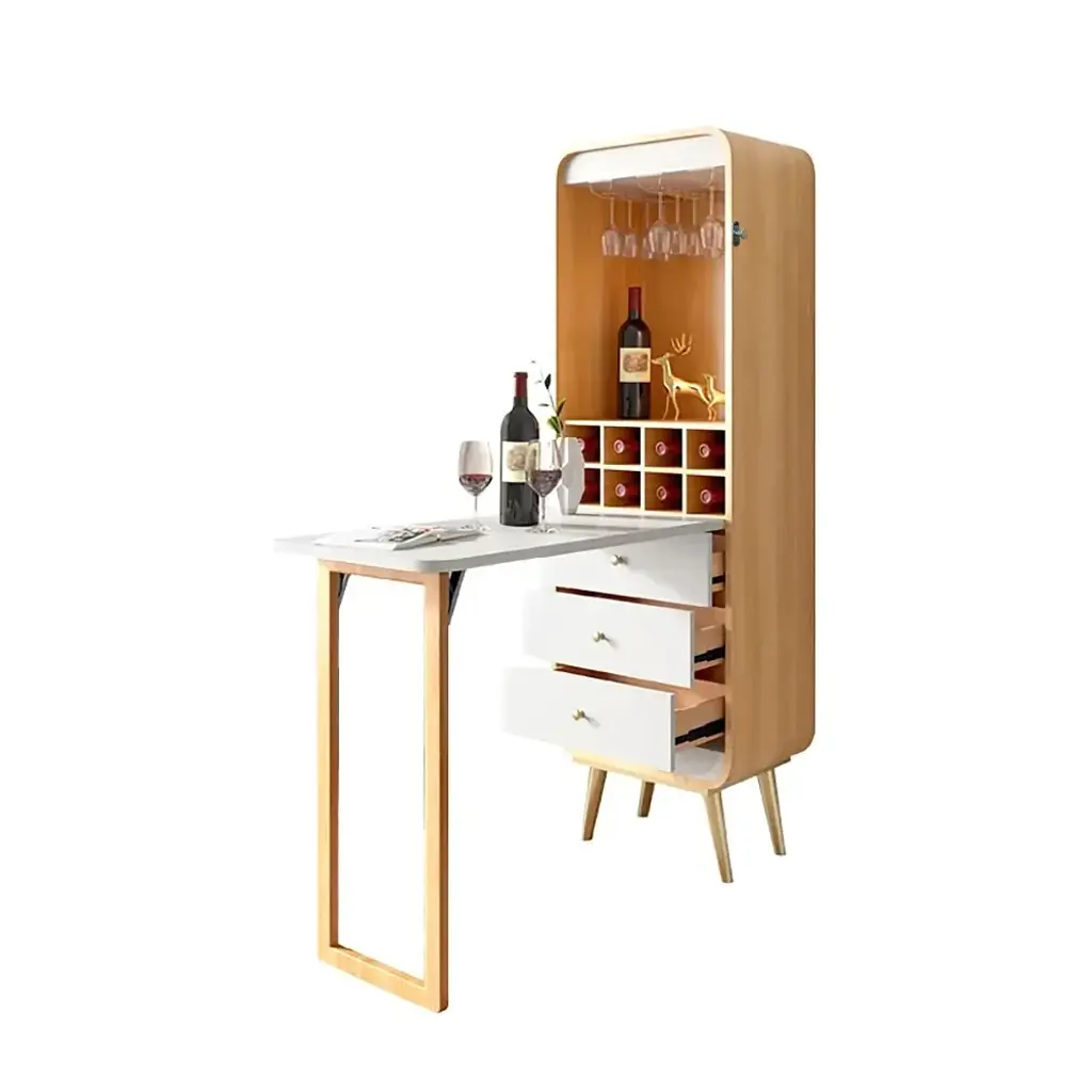 Foldable Bar Cabinet Convertible With Wine Rack & Table & 3 Drawers