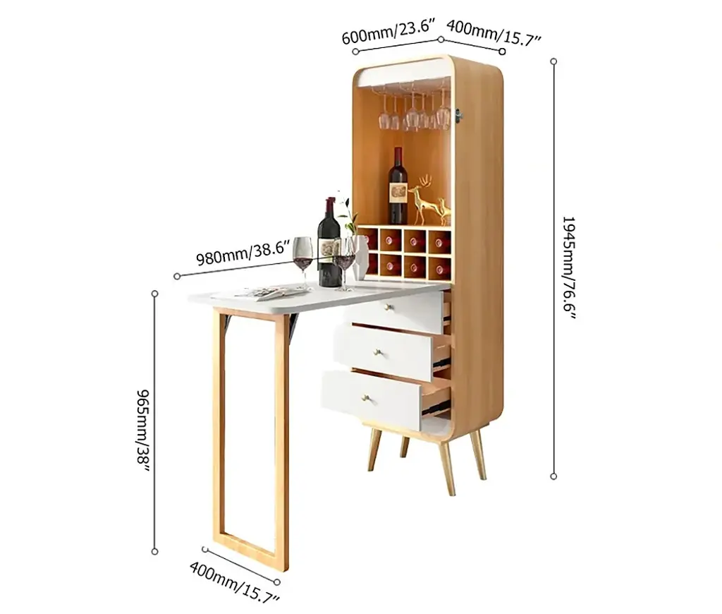 MDF, stainless steel, and matte lacquer lend a modern charm to this design. It can be converted from the cabinet to the bar table that will save your space when not in use. Stemware holders, wine racks and 3 drawers offer enough space for your bottles, glassware, and more.